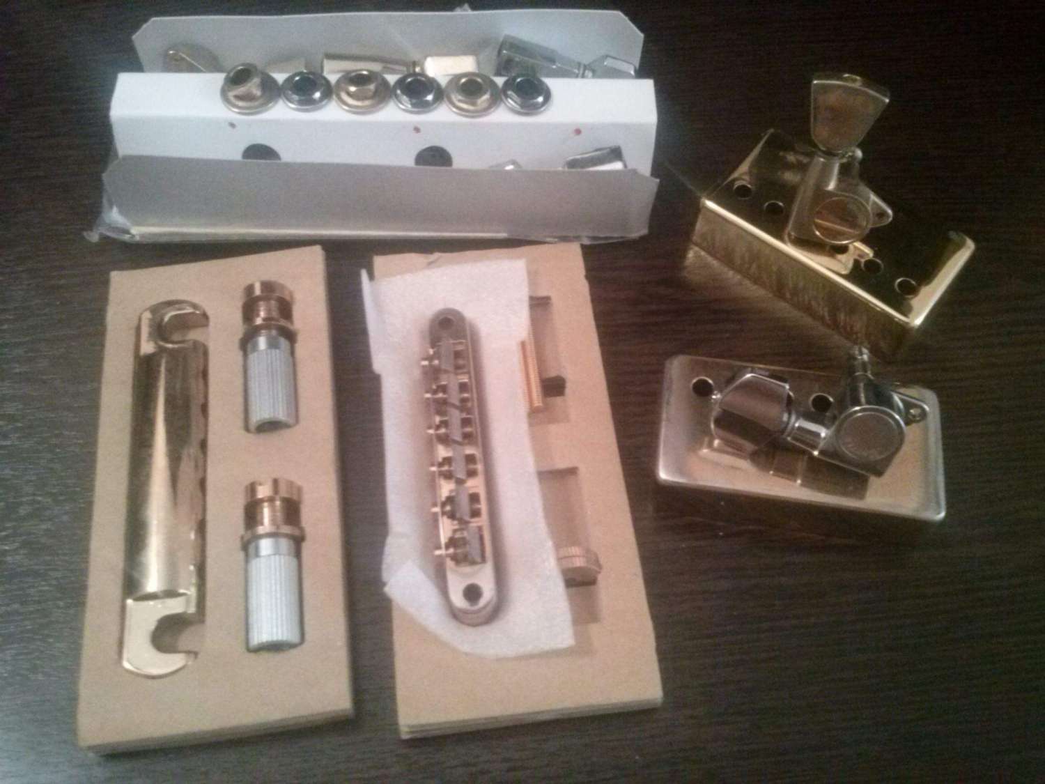Продам бридж (gold), струнодержатель (снято с Greco, gold), 3 колка Greco gold и 3 колка Gotoh chrom, крышки звукоснимателя gold (одна Китай, другая снята с Greco).