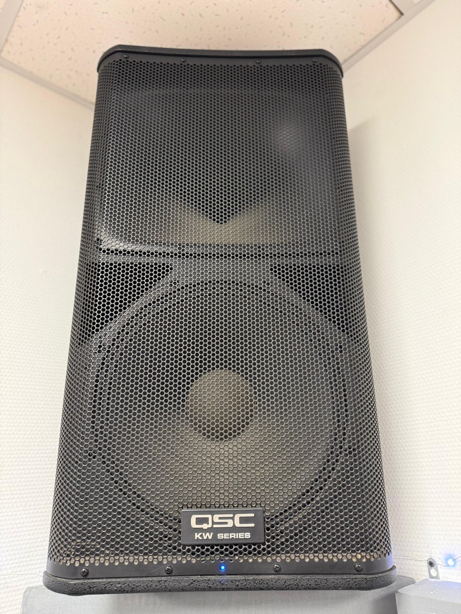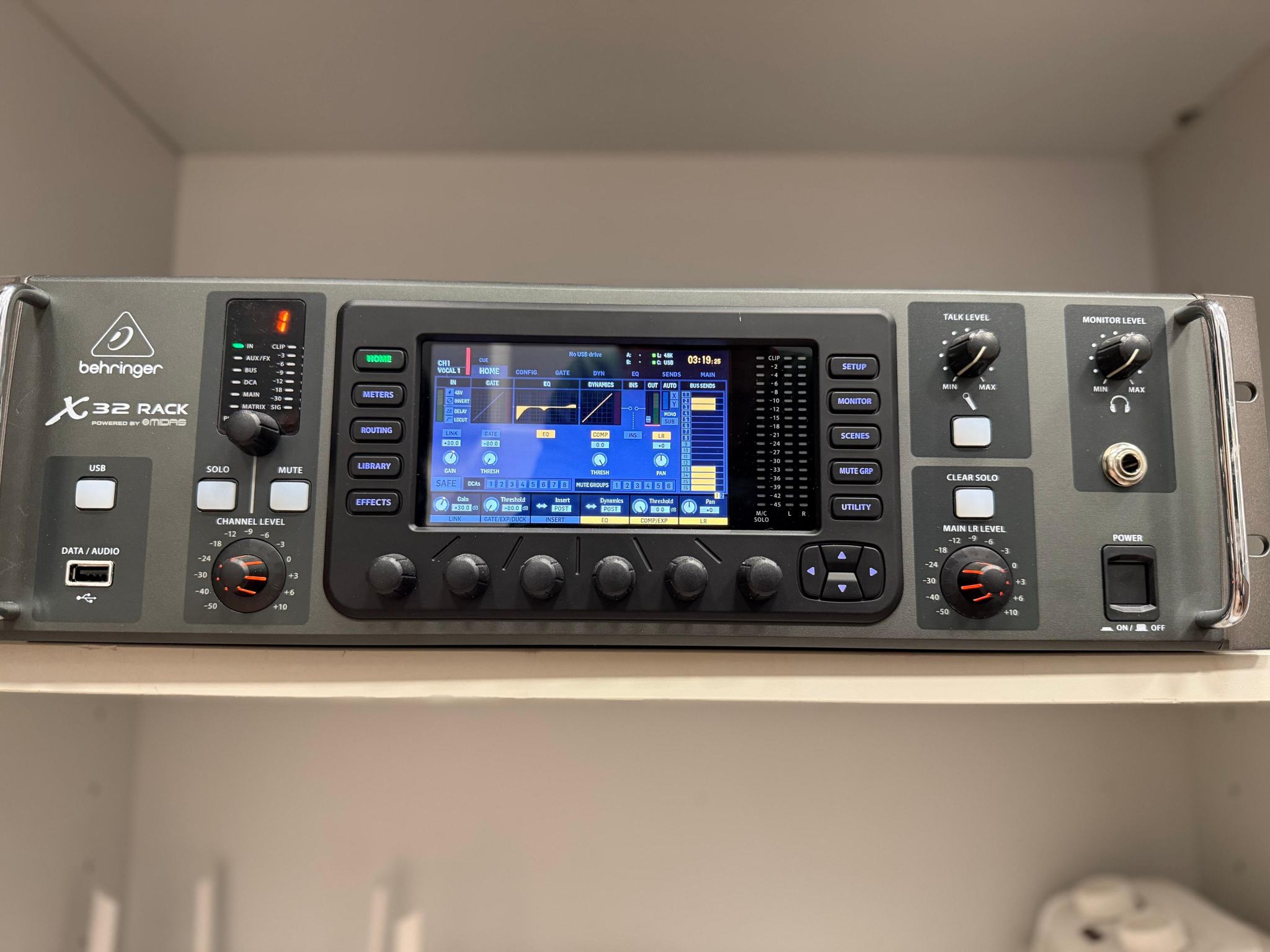 Линия: Микшерный пульт Behringer X32 Rack, Колонки QSC KW 152, монитор барабанщика Wharfedale.