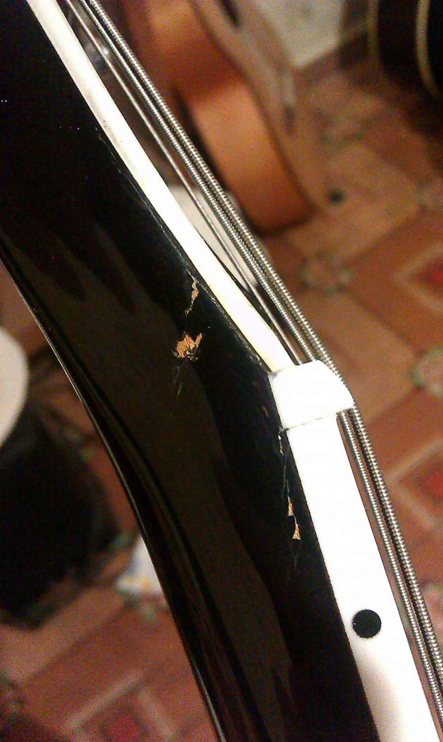 Добрый день! Хотел посоветоваться с профессионалом... Прошу прощения если глупый вопрос, в гитарных поломках я нуб и как-то до сих пор не проходил через ремонт) Недавно приехала новенькая гитара (Gibson Midtown Custom) вот с такой вот неприятностью... (см. фото ниже) Пара мелких сколов лака, в принципе, неприятны, но не критичны, а вот трещинка обеспокоила. Идёт, если видно на фото, аккурат вдоль белой окантовки головы грифа, в длину трещина примерно 1-1,5см... Стоит ли о ней беспокоиться и идти залатывать дефект, или это незначительный и неопасный "коц", с которым можно жить?) Заранее спасибо!