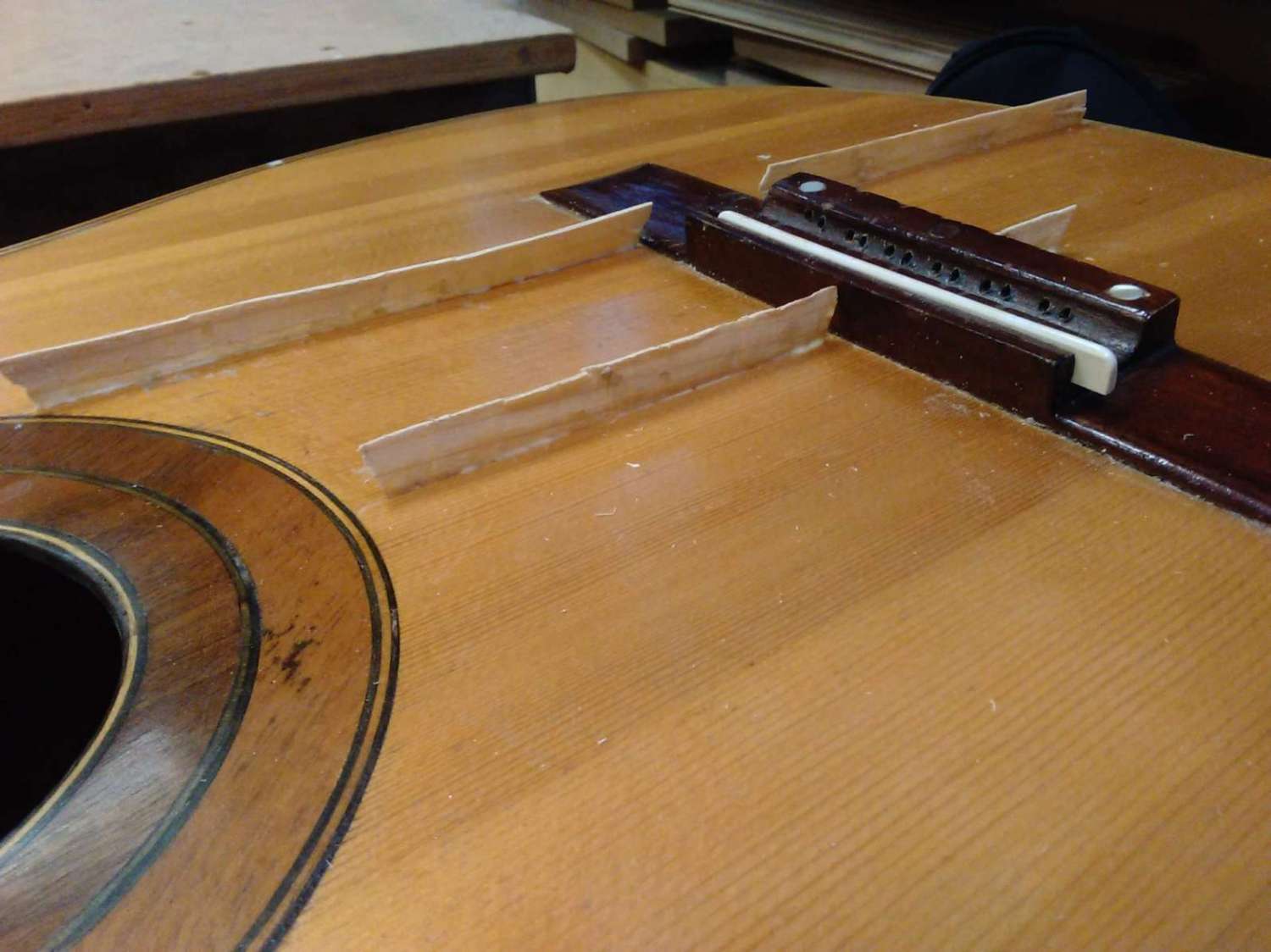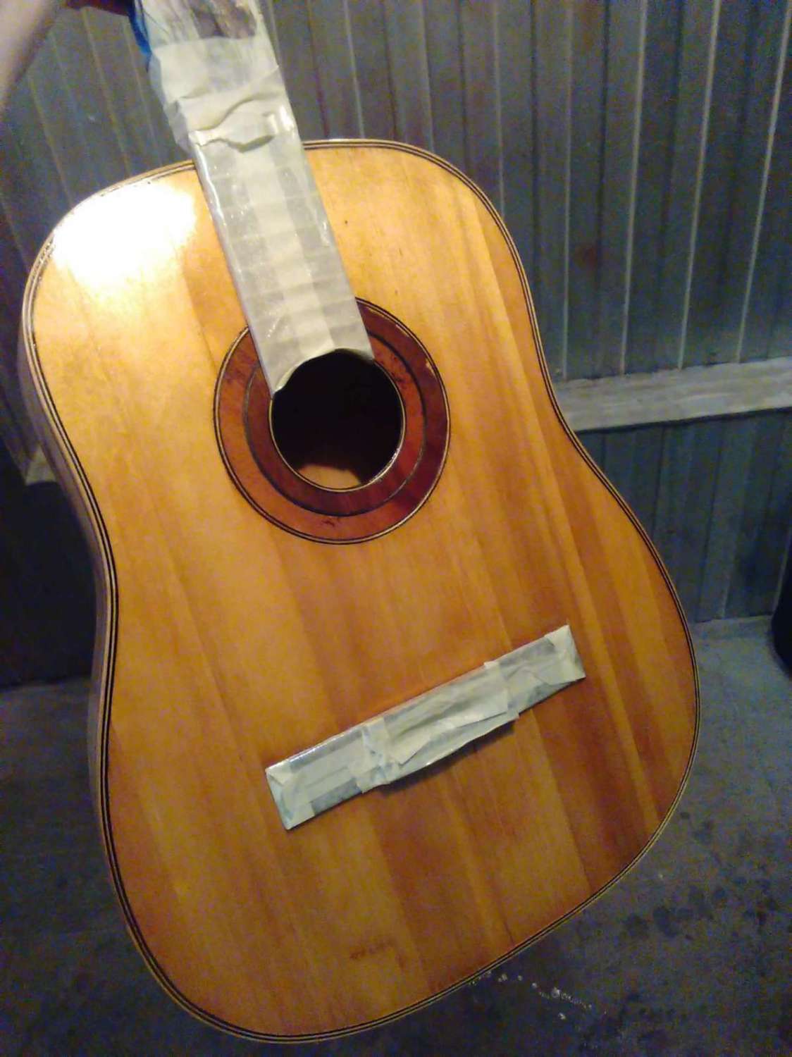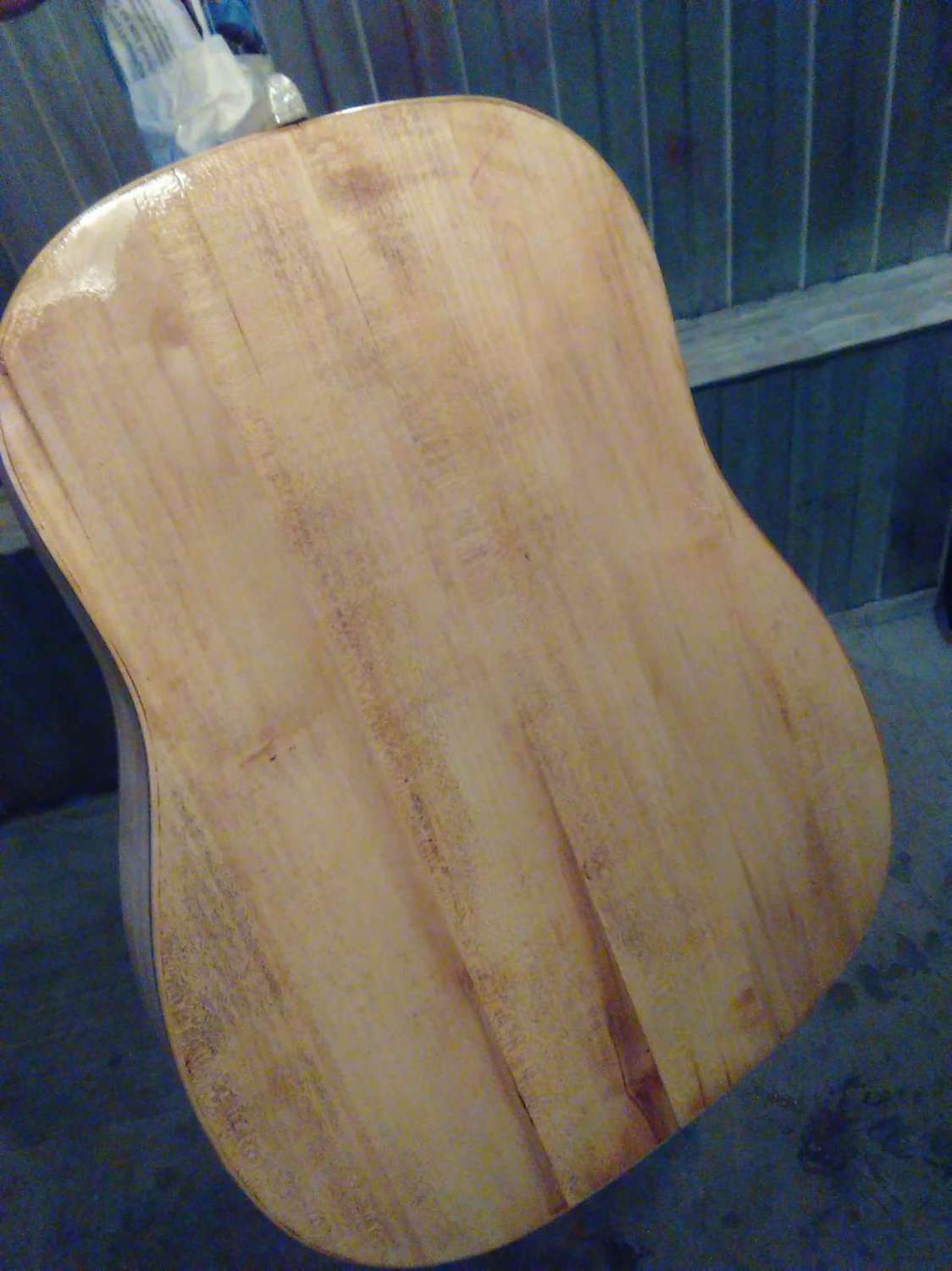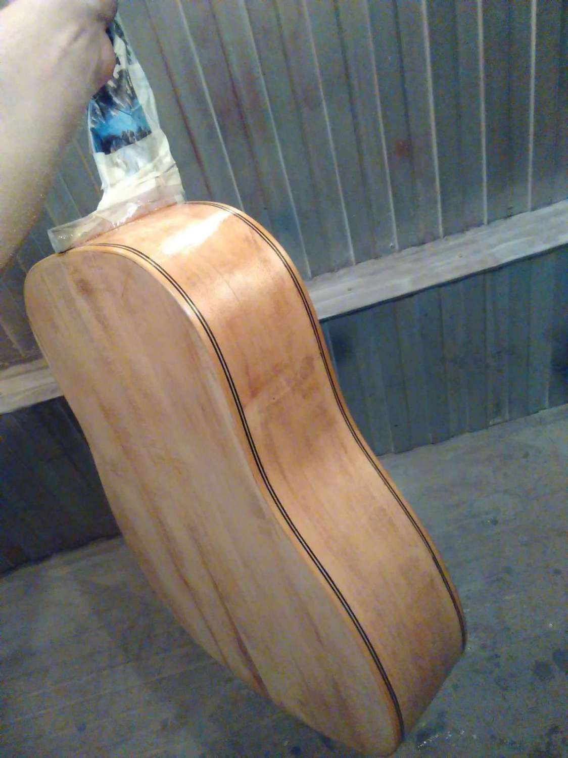 не проблема, по стараюсь по светлей сделать по возможности, там просто по деке видно(мне) что она была покрашена пятнами, я хочу их вывести, чтоб дека стала однотонной по максимуму. ну и от этого цвета уже буду исходить, лак всё равно прозрачный как вода, а обечайку и нижнюю прошлый мастер видимо марил под цвет самой тёмно части нижней деки внизу, чтоб видно не было этого дефекта дерева, так что я планирую точно так же действовать