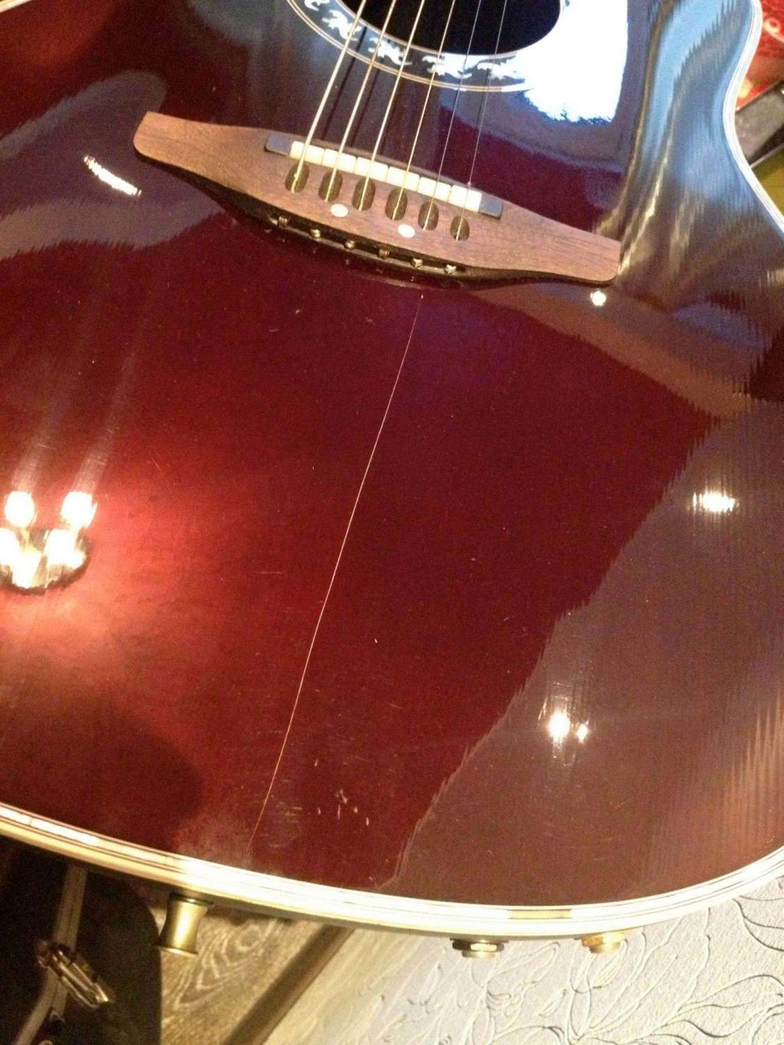 .... ну если перекрасить - перелачить деку можно сделать чтобы " было как не было " , но по деньгам будет как стоимость гитары ( а возможно и дороже - не вижу что за палка ) .