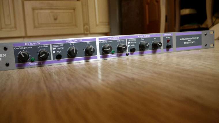Эксайтер Aphex 104 (MADE IN USA) - двухканальное устройство, синтезатор высокочастотных гармоник. Входы и выходы симметричные (+4/-10 дБ), на джеках. Переключатель Harmonics изменяет количество генерируемых гармоник (Normal/High), регулятор Tune устанавливает частоту среза пропускающего фильтра высоких частот (от 800 Гц до 6 кГц), регулятор Mix определяет уровень обработанного сигнала, подмешиваемого к прямому. Aphex 104 содержит также процессор низких частот Big Bottom, который отделяет низкочастотный сигнал (посредством пропускающего фильтра низких частот, частота среза 100 Гц), изменяет его фазу, компрессирует и добавляет к прямому. При этом при понижении уровня исходного сигнала добавляется больше обработанного и наоборот. В результате происходит подъем низких частот без фактического увеличения уровня общего сигнала. В блоке Big Bottom регулятором Overhang/Drive устанавливается входной уровень процессора низких частот (есть светодиодный индикатор уровня), а регулятором Girth/Mix управляют уровнем обработанного сигнала, добавляемого к основному.