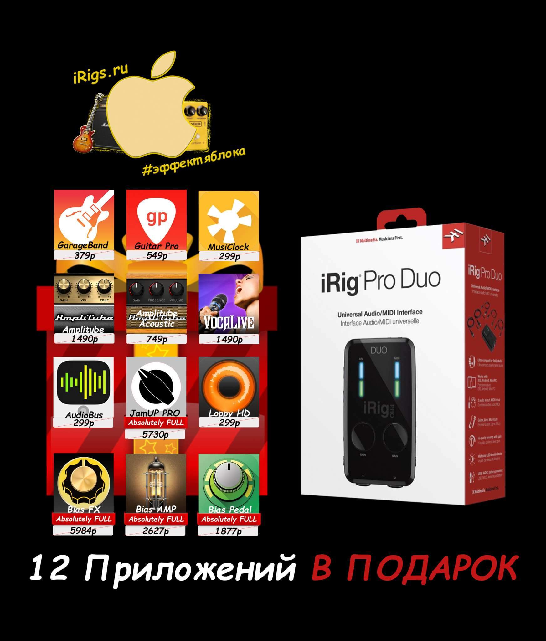 Покупая iRig Pro Duo у нас, вы получаете бесплатный доступ к загрузке 12 наиболее популярных платных приложений из AppStore (Garageband, JamUp Pro, Bias FX, Bias Amp, Bias Pedal (все 4 со всеми доп паками усилителей и примочек), VocaLive, Amplitube (+Acoustic), Guitar Pro, Musiclock, Loppy HD и Audiobus (цена в AppStore за все приложения = 22000р). Не путать с бесплатными Free версиями приложений! Технические характеристики IK Multimedia iRig PRO DUO: •2 Комбинированных входа XLR/Jack;