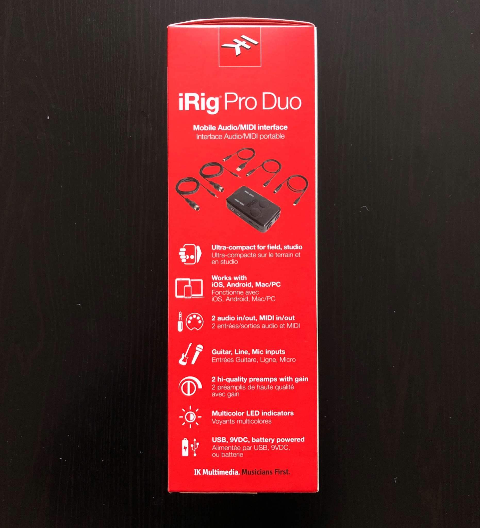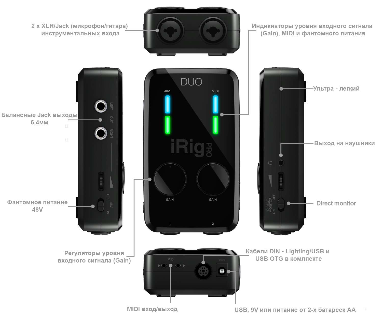 iRig PRO Duo - 2-х канальная звуковая карта, оборудованная комбинированными 1/4"-XLR-входами и встроенным 48-В фантомным питанием для использования со студийными конденсаторными микрофонами. Интерфейс включает предусилители с регулировками усиления, 24-битный АЦП, светодиодные индикаторы для отображения состояния устройства, MIDI, фантомного питания и уровня сигнала, выходы под наушники/мониторы/микшер и пр. на корпусе, вход/выход MIDI, а также функцию Direct Monitoring. Подходит не только для Apple устройств, но и для ПК!
