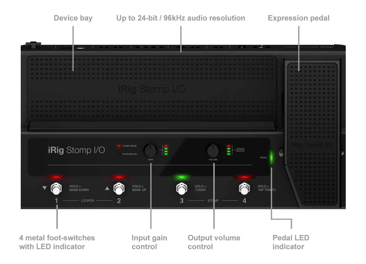Технические характеристики iRig Stomp I/O:• 4 кнопки для управления, педаль экспрессии с оптическим переключателем;