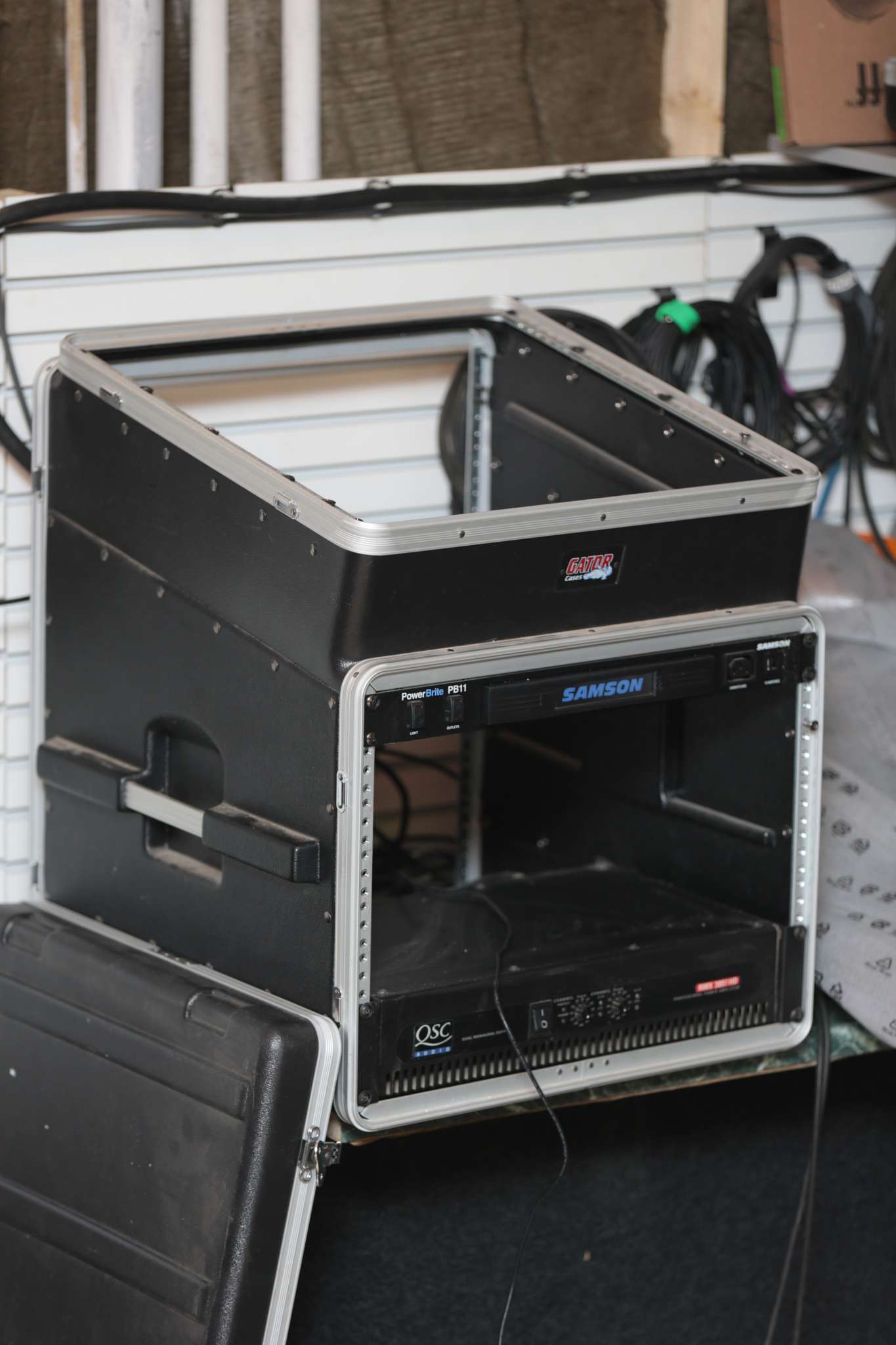 Спереди 8u, сзади 12u, сверху наклонное отделение для микшера 10u