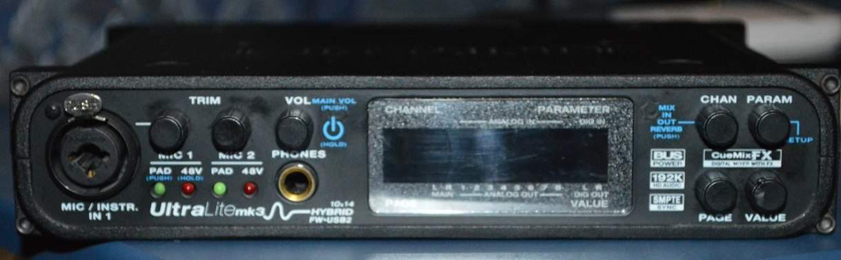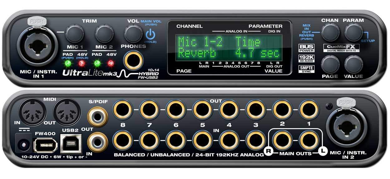 Крутейший аудио интерфейс cо встроенным DSP и обработками, работает как по USB так и Firewire. Подходит для профессиональной работы как в качестве звуковой карты так и в качестве микшера. Подходит для записи микрофонов и гитары.