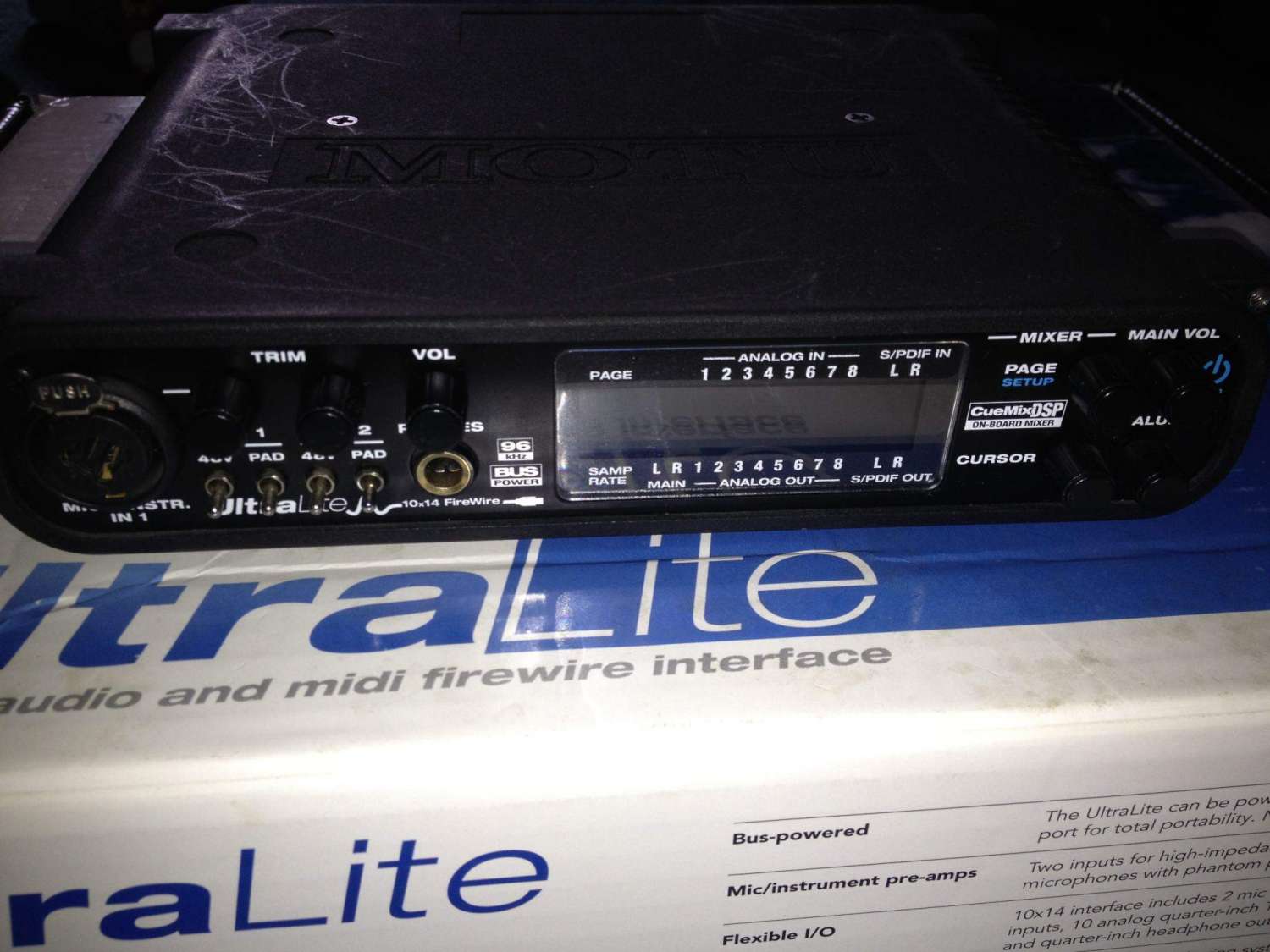 Продается Motu Ultralite 10x14. Firewire. 2 входа с мик. предуселителями с фантомным питанием. Spdif in/out, Midi in/out, 8 симетричных входов, 8 выходов. Может использоваться отдельно от компьютера в роли микшера. Звук очень качественный. Впридачу дам PCI Firewire контроллер на чипе Texas Instruments, поскольку с другими чипами работать не хочет. 9.000р.
