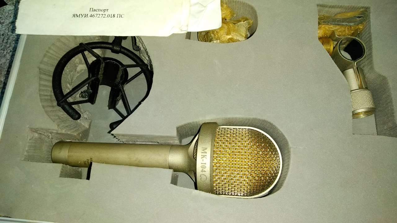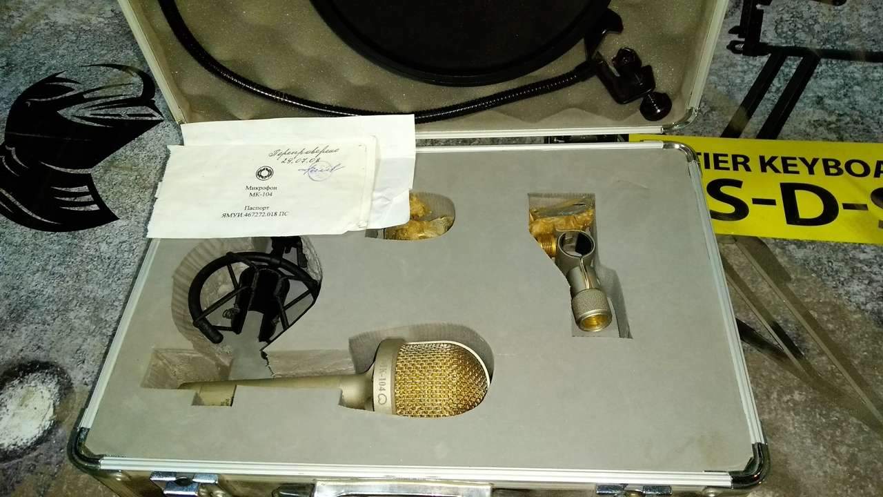 МК-104 - студийный микрофон с характеристикой направленности близкой к кардиоиде. Он имеет новый широкомембранный капсюль с позолоченной диафрагмой диаметром 27 мм. Микрофон выполнен по модульному принципу, имеет высококачественный усилитель и аттенюатор -10 дБ. Благодаря специальной форме решетки удалось заметно снизить отражения под ней, что позволило добиться более ровной АЧХ в области верхней середины.