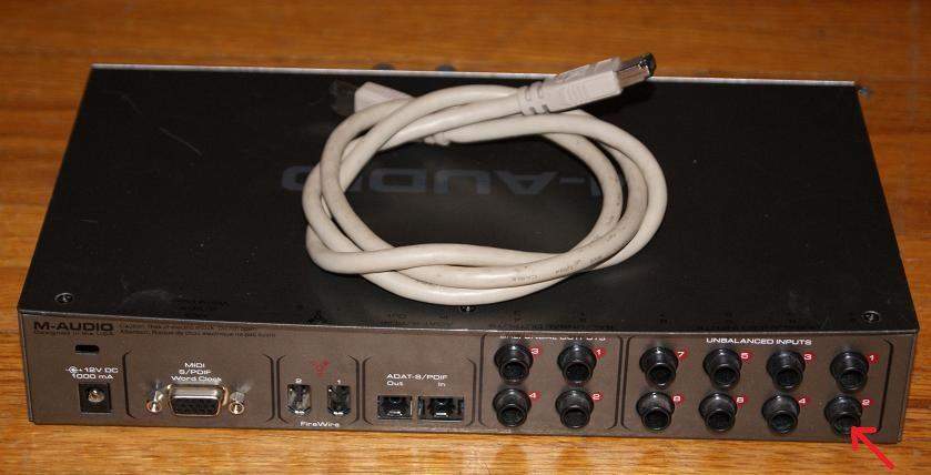 Всё работает, кроме одного. Не работает линейный вход №2. Показан стрелочкой на втором фото. По сути в 99,9% случаев он и не нужен т.к. дублирует инстр./микр вход (который работает без проблем) и смысла его использовать особого нет. К тому же есть ещё три пары линейных входов. Если есть вопросы-пишите. Всё объясню. Миди, Адат, klock не проверял за отсутствием переходника. Питание как от внешнего источника, так и по Firewire (6*6)