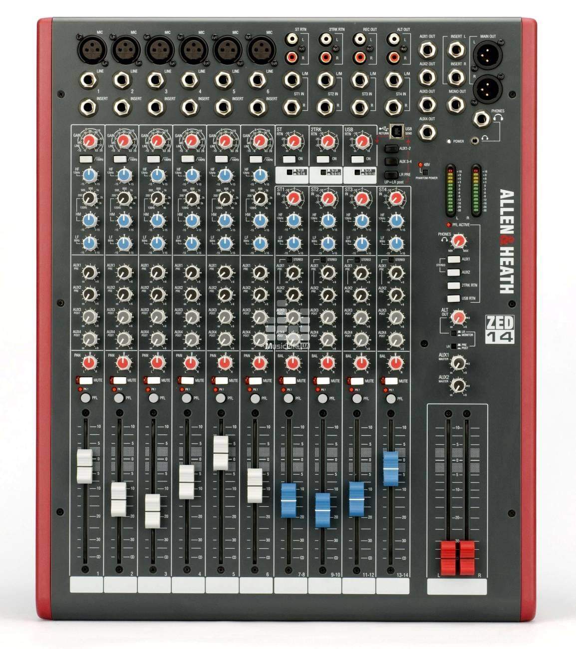 ZED-14 отличается высококачественными микрофонными предусилителями, Микрофонные предусилители Duo PreTM имеют оригинальный дизайн и двухкаскадное исполнение, что позволяет точно управлять усилением сигнала на каждом каскаде, предлагая широкий динамический диапазон. ZED-14 имеет продуманную систему микширования и содержит: 2 посыла pre-fade, канальные PFL посылы, 2TRK и USB возвраты, выходы LR главного микса. Контроль над всеми сиигналами осуществляется с помощью звуковых мониторов или головных телефонов, которые выбираются в секции мониторинга.