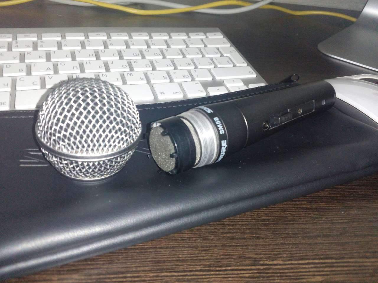 Shure SM58. Идеальное состояние, не считая легкой потертости в районе кнопки. Использовался только дома, пел в него только молодой пацан. В комплекте чехол нулёвый.