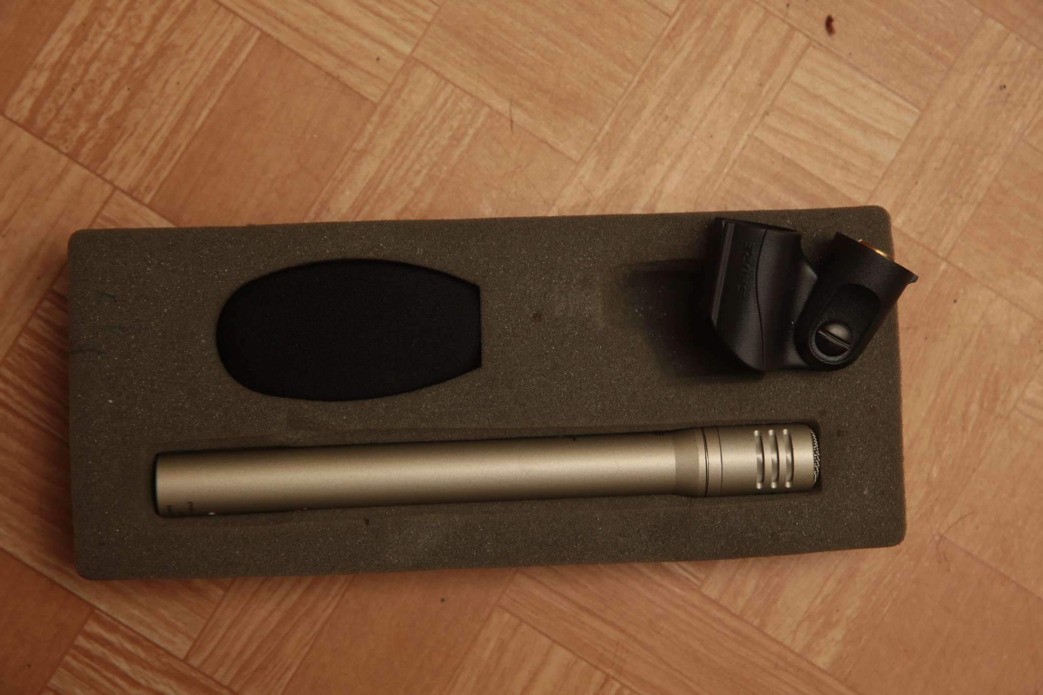 Состояние микрофона отличное. Нет коробочки, только вкладыш поролоновый. Держатель микрофона куплен отдельно в Германии - Shure A57F (для микрофонов Shure SM 81), но в углубление в поролоне по какой-то причине не подходит (но, главное, к микрофону подходит