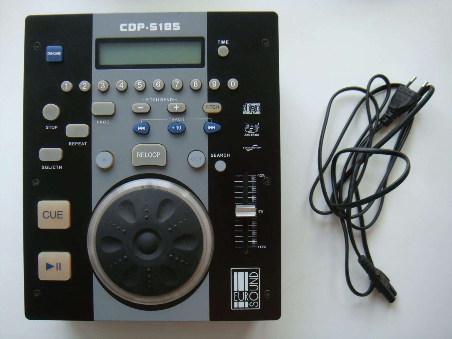 Однодисковый настольный CD-проигрыватель для DJ. Очередной бюджетный CD-проигыватель от компании Eurosound CDP-S185 - это настольный однодисковый тейблтоп с фронтальной слотовой загрузкой. Его отличают следующие функции: большое удобное JOG-колесо, Pitch-контроль и Pitch-bend, 10 кнопок для быстрого доступа к трекам, футкция Loop, подсветка лотков, возможность программирования треков, 40-секундный антишок и 0,01 сек - время чтения диска.