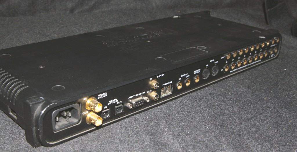 Есть два микрофонных/инструментальных входа на передней панели (комбинированные разъемы XLR/джек) с регуляторами чувствительности, кнопками фантомного питания (48 В) и посылами (джеки, до АЦП), восемь симметричных аналоговых входов и восемь выходов (джеки, номинальная чувствительность входов индивидуально переключается +4/-10 дБ), оптический цифровой интерфейс (переключается между двухканальным форматом SPDIF и восьмиканальным форматом ADAT, в формате ADAT поддерживаются четыре канала с частотой дискретизации 88,2 или 96 кГц), электрический цифровой интерфейс формата SPDIF (RCA, поддерживает 24/96), два основных аналоговых выхода (джеки), стереовыход для наушников (джек на передней панели), MIDI-вход и выход, вход и выход Word clock (BNC), вход и выход SMPTE (джеки), вход ADAT-синхронизации (девятиконтактный D-Sub), вход (джек) для педального переключателя (управляет врезкой при записи), два разъема FireWire (возможно одновременное использование нескольких устройств).
