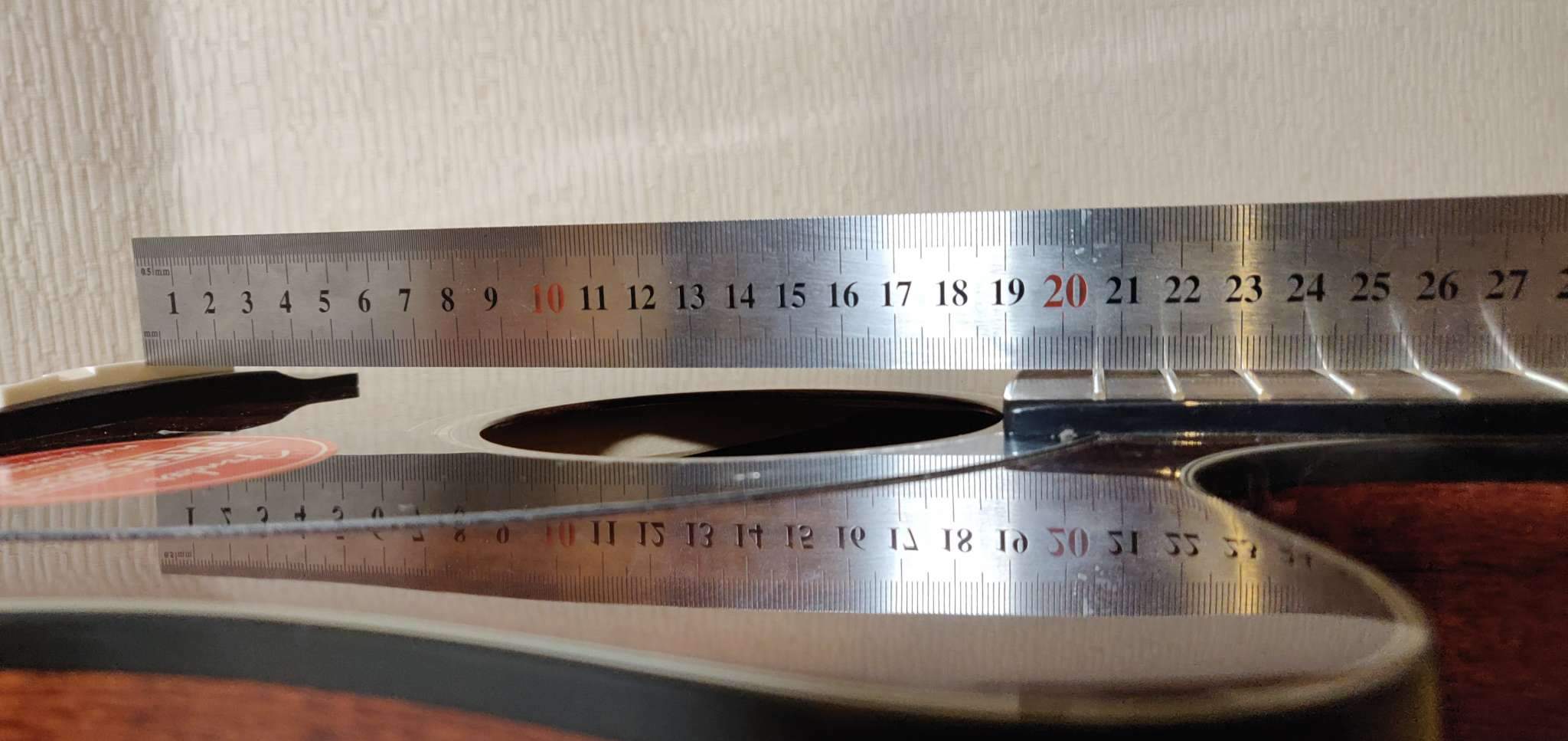 Приветствую всех! Сорян, что так долго не писал. Проблему эту решил, гитара хранится в кофре, недели на 2-3 во внутрь гитары, под бридж, положил баночку с водой и губкой. После достал померял линейкой и все бридж в один уровень с грифом, теперь гитара строит как надо, приятно играть. На форуме указано, хранение должно осуществляться при 50% влажности.