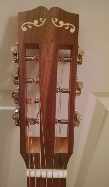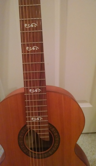 Гитара выглядит очень изящно. Это подарок, так что вид тоже играет роль. Очень здорово смотрятся инкрустации на грифе (из чего они сделаны?)