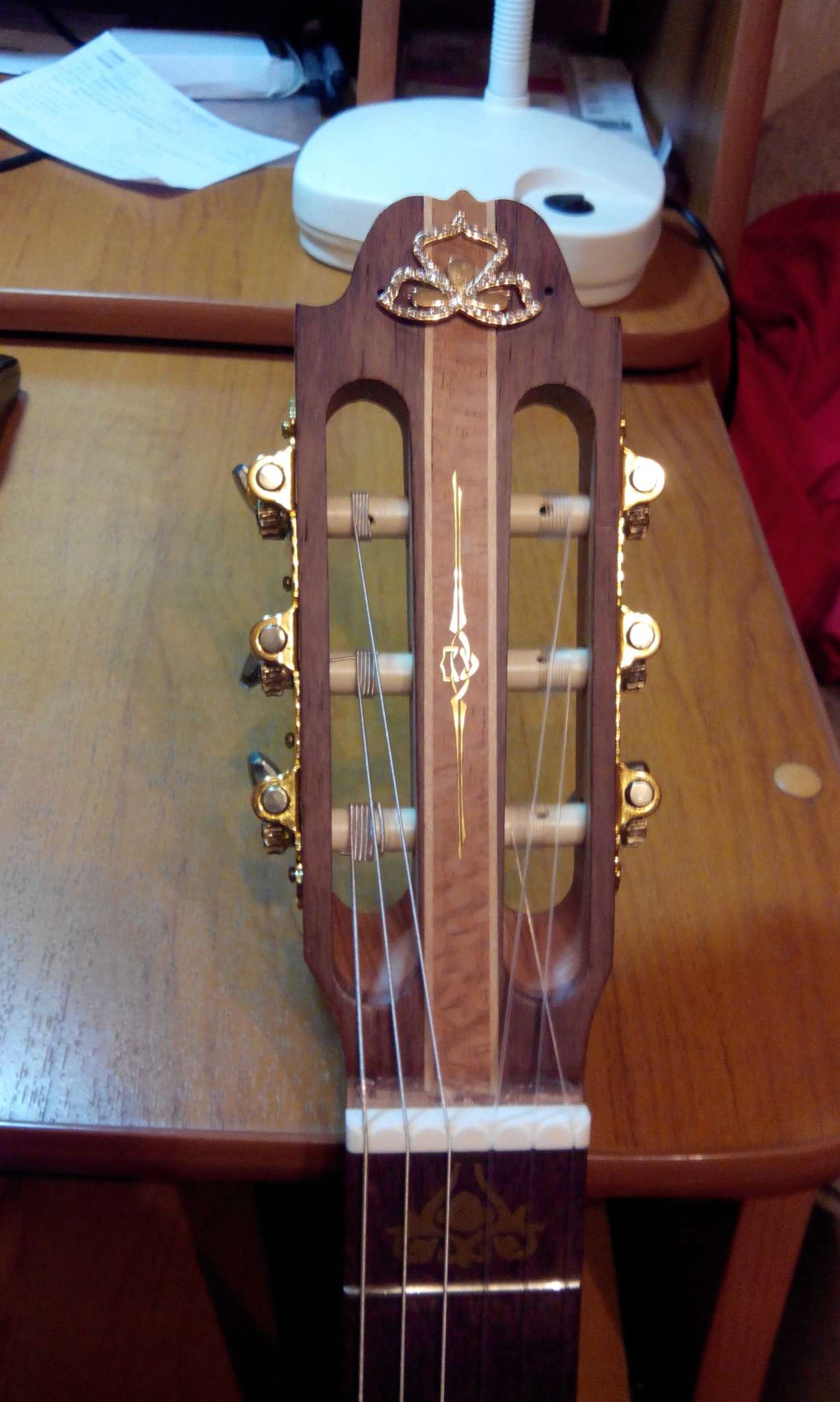 НАКЛАДКА ГРИФА: Палисандр (по заявлению производителя). Хотя гитарный мастер, который ремонтировал инструмент, усомнился в этом и показал мне несколько разных палисандровых накладок. Они были другими и по рисунку, и по оттенку. Хотя может просто разные места произрастания палисандра. Есть небольшие микротрещины в нижней части накладки, которые видны только при пристальном рассмотрении. Это уже дефекты древесины. Лады вставлены аккуратно и не царапали руку по краям грифа. По верхнему краю установлены маркеры ладов (заклеены в дальнейшем стразами Сваровски, так мне их лучше видно). Плоскость от верхнего порожка до 12 лада не совсем ровная. Прогиб в районе 6 лада около 0, 3 мм. От 12 лада и до резонаторного отверстия есть небольшой горб. Величину не мерял. Скос накладки от 12 лада до резонаторного отверстия (для игры в высоких позициях) отсутствует. Чтобы предотвратить возможное задевание струн за лады в районе «горба» при регулировке высоты струн над 12 ладом, мы пока их просто немного сточили. Плюс еще немного шлифанули лады с 1 по 12 лад по плоскости с последующей полировкой. Лады от 13 до 20 полировать не стали, поскольку «горб» планирую со временем убрать и сделать скос накладки. Тогда уже заменю и отполирую 13-20 лады. Недавно начался отопительный сезон. Вылез 1 лад со стороны 1 струны, который был вынут и заново вклеен на эпоксидку. Также немного вылезли лады по краям (дерево сохнет). Если будет так дальше – придется шлифовать лады. Расстояния от струн до края грифа одинаково со обеих сторон, что говорит о том, что гриф вклеен ровно.