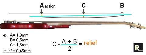 Максимальный прогиб грифа не в точке С (около 6 лада) , а на 3,4 ладах. И такой уже приличный, хотелось бы сделать поменьше, но начинает звенеть на 3,4 - там самая низкая точка получается и звенит уже об 5,6 лад. Из-за этого не удается опустить меньше чем на 2,4мм над двенадцатым ладом.