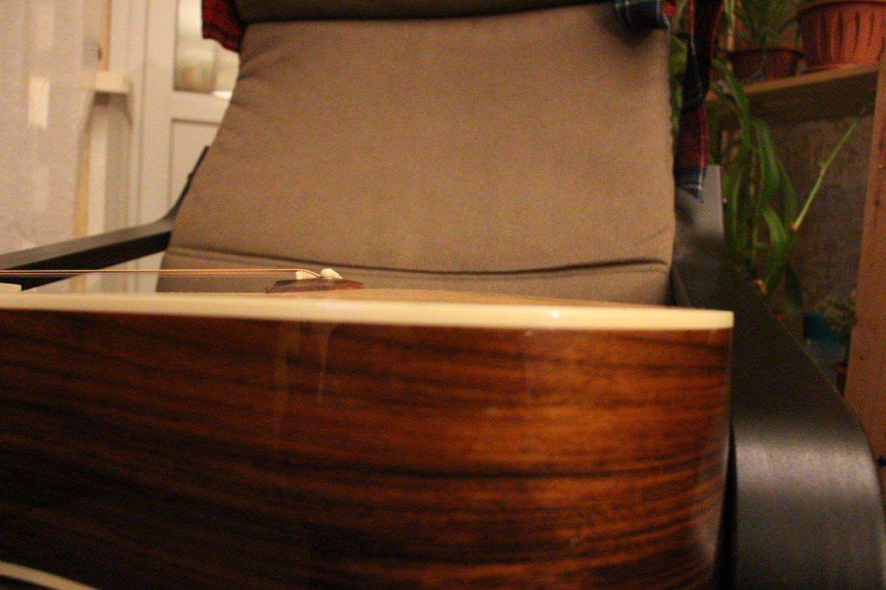 Отделка – традиционная для гитар Дофф матовая лакировка с очень легкой тонировкой красно-коричневого оттенка. На грифе слой лака толще и поверхность более гладкая. Необходимо отметить, что вмятины на матовой поверхности остаются от очень легких воздействий. Вот на фото вмятина от кончика первой струны, которая выскользнула из отверстия при натяжке и чуть при этом задела деку: