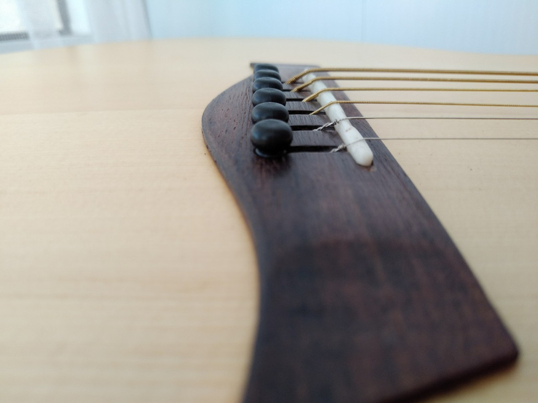 И пропилы сделал глубокие от пинов до нижнего порожка - теперь струны под хорошим углом "переламываются" на порожке и уходят вниз к пинам.