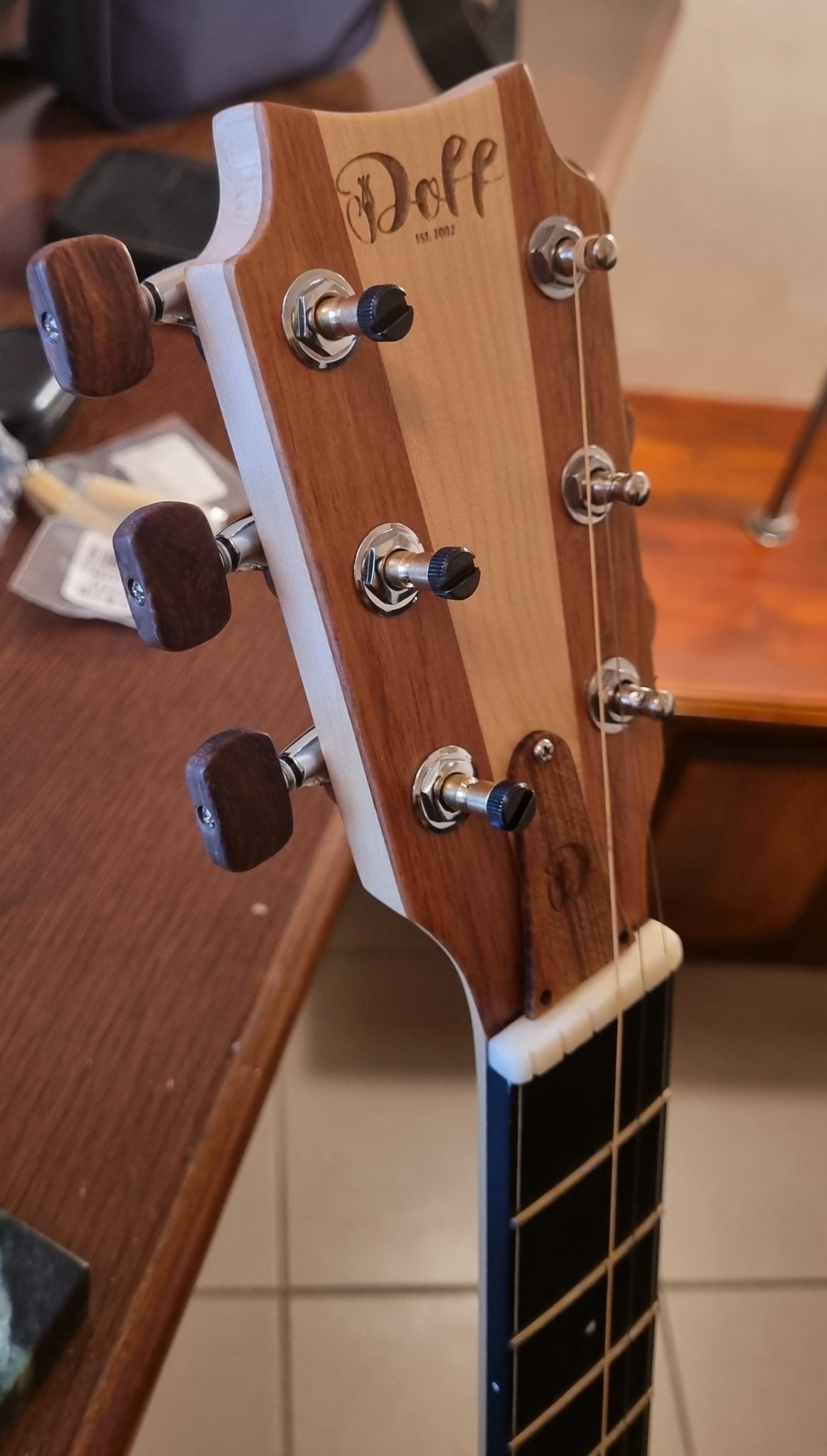 Предыстория такова....приобрел я однажды Дофф парлор 032. С ним не все было в порядке, не буду описывать, что, кому интересно- в тематической ветке гитар Дофф я все подробно описал. Далее руководство Дофф мне инструмент поменяло.... Естественно, отстроил под себя....Новый Дофф 032 очень зашел по звуку и играбельности. До такой степени, что видоизменять что- либо в нем было боязно, так все было хорошо. Но , в силу того, что запчасти были заказаны и пришли- понеслось....нижний порожек замена на кость- это по-умолчанию и сразу. Результат уже не раз получаемый на других инструментах и естественно на этом сугубо положительный.