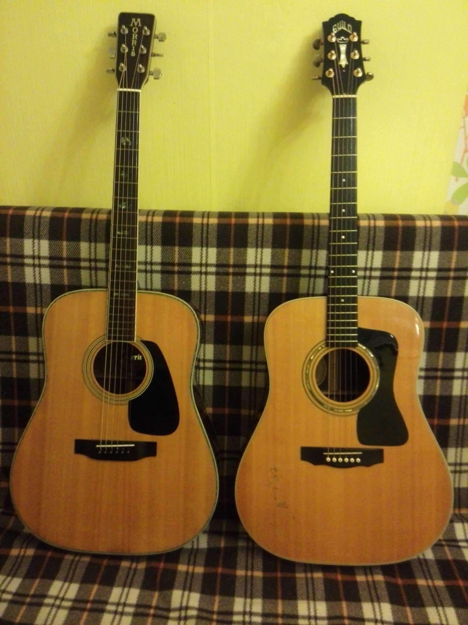 Сравнить по звуку Гилд с Моррисом пока сложно, т.к. во первых струны стоят на Моррисе тонкие 11-е и похоже бронза, на Гилде 12-е фосфорбронза... Я тонкие струны не понимаю, они не могут раскачать инструмент, использую 12-13 калибр.