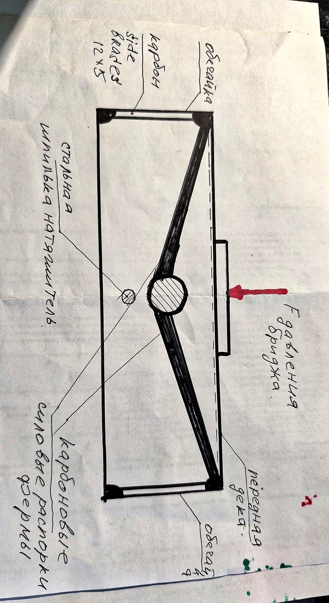 ... и добавил:На схеме пунктиром показан карбоновую ленту приклеенную к деке в натянутом, напряженном состоянии в районе бриджа. Она выдерживает на разрыв больше 5 тонн. Таким образом я получил свободную мембрану большой площади свободной от всякого мусора. Колебания компрессионные как у динамика, барабана, батута... В классической схеме гитар мы имеем колебания по принципу детских качелей где две половинки деки колеблется относительно бриджа в противофазе.