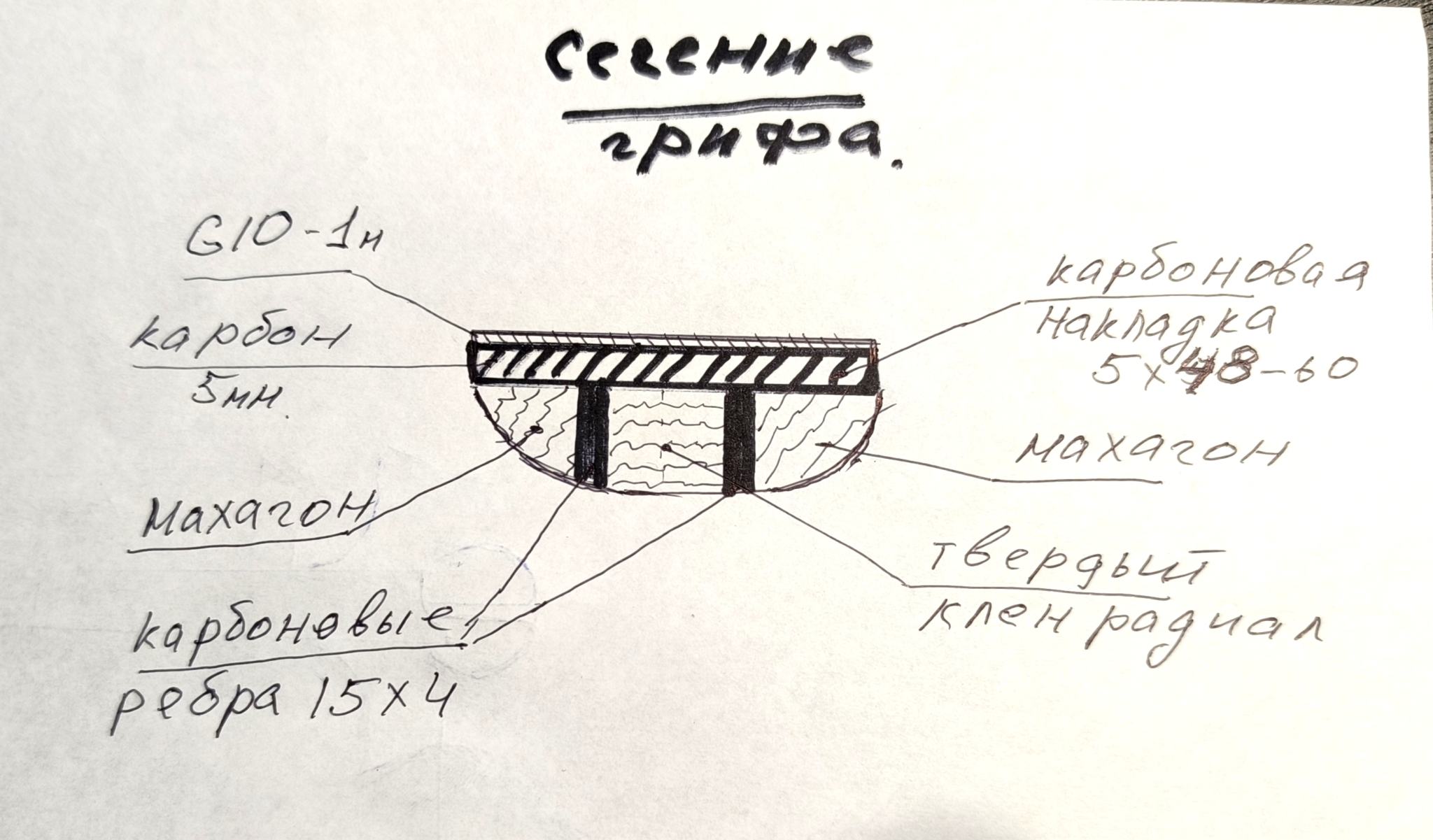 Дерево пропитано и стабилизировано маслом по оружейной технологии. В каких условиях работает охотничий нож особо зимой при разделке зверя думаю никому объяснять не надо. Какие нагрузки выдержит такая конструкция? 5мм толщина авиационного карбона, плюс 1 мм G10 плюс ребра жёсткости 15х4 из того же карбона. Не говоря уже о переклеенной достаточно прочной древесине. Максимально возможный изгибающий момент от струн 20кг / см. Что просто смешно по сравнению с вертолетной лопастью.... Ни один анкер такую конструкцию не прогнет ... Резьбу сорвет... Мне возразили а как же регулировка грифа по высоте? А я спрошу а что только анкером можно регулировать? Тот же Тейлор не брезгует болтом... Только здесь болт превращается в резьбовую шпильку которая проходит насквозь и выходит в пятке... Такая конструкция намного удобней для регулировки и выполняет еще одну функцию, компенсирует натяжение струн снимая нагрузку с тонкой передней деки....