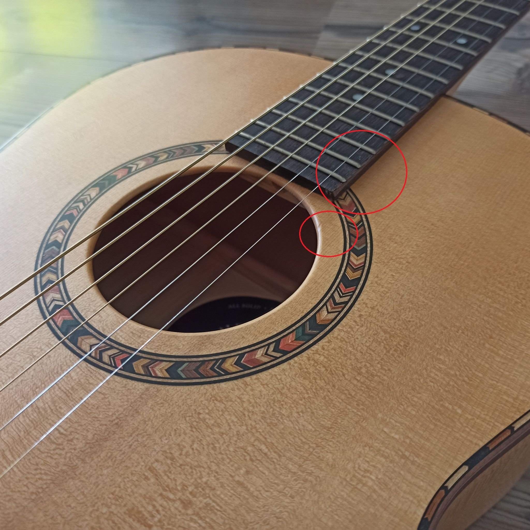 Встретился в Москве с представителем фабрики, пощупал гитару аналогичную свежей партии, добавил кантик (ну, не могу иначе, типа художник), решил не брать электроакустику и.. внес предоплату. Гитара была готова в срок и со скидкой в честь ДР обошлась мне в 23000 рублей. Инструмент вышел добротным, красивым имхо и звук.. Я не спец, но хорош для такой малютки! Из косячков - как я ни просил чтобы лады были идеальны, не вышло ) Нет, не торчат, в кровь пальцы не режут, но мне казалось, что при мелкосерийном производстве вполне можно довести каждый инструмент до идеала. Наверное, мы зажрались ) За 2 месяца каждодневной игры (+ старший нарезал) звук угас. Мне даже стало казаться, что гитара не але, но вчера поставил новенькие EJ26 - вах! Все вернулось. )