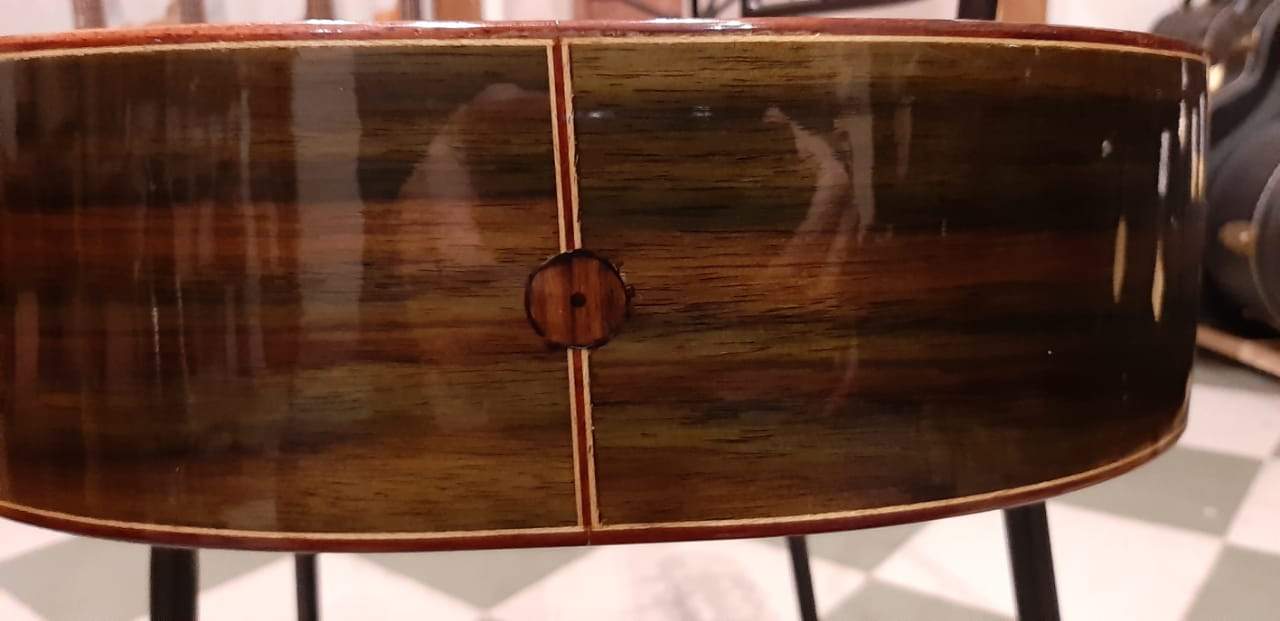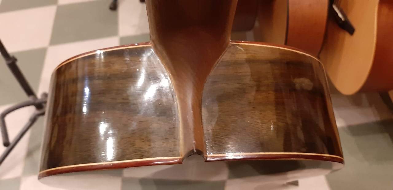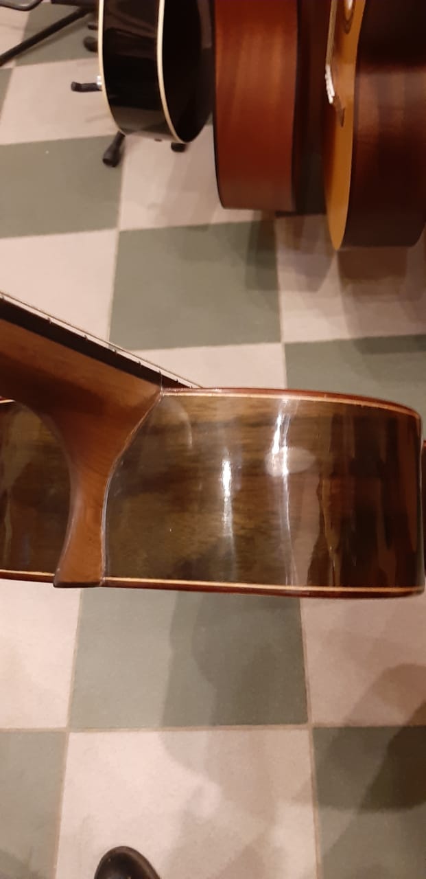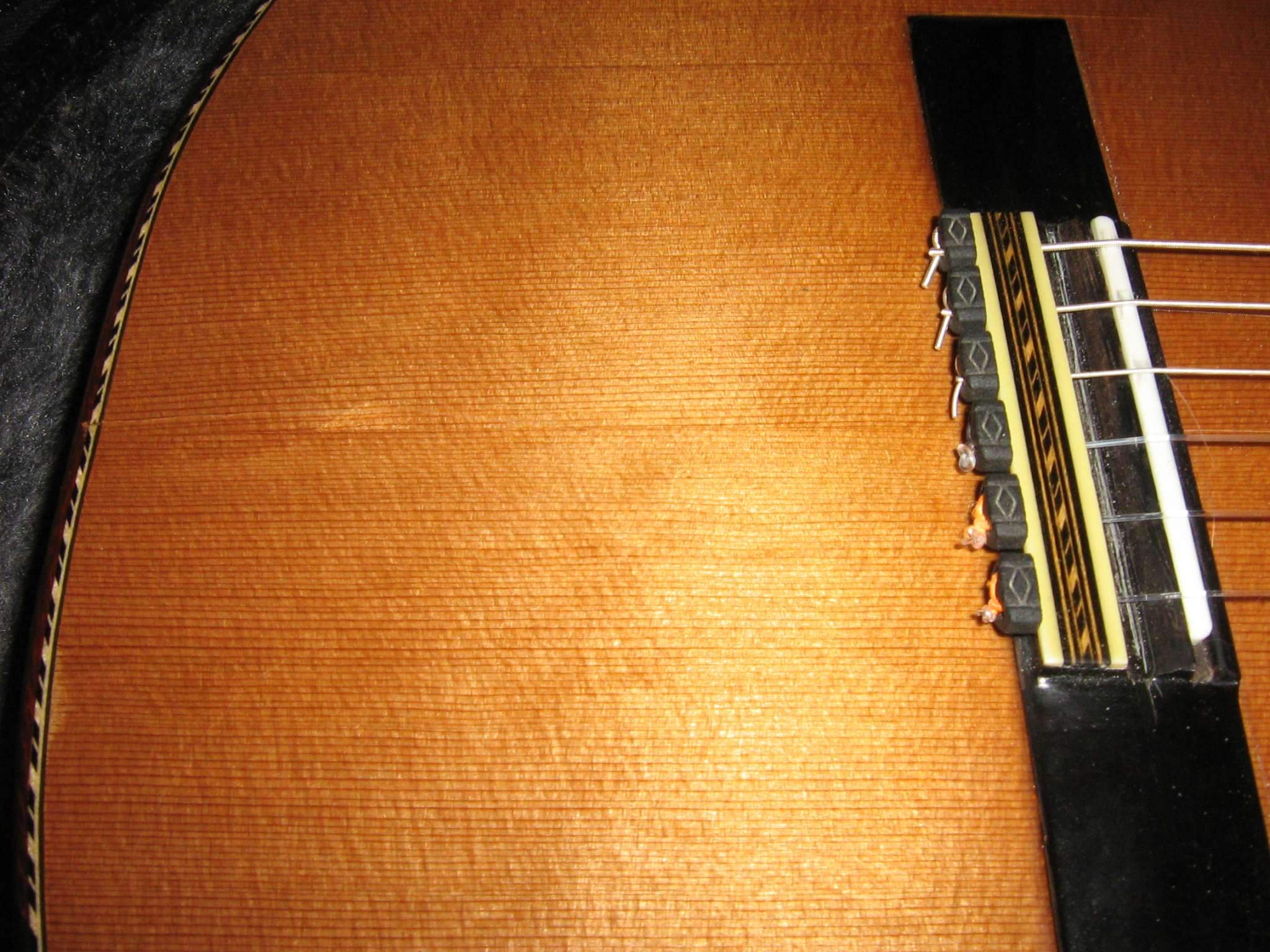 2) Мензура - я собирался заказывать вполне обыкновенный инструмент со стандартной 650мм. мензурой. После разговоров по мензуре он меня переубедил, что мне, оказывается, нужна гитара с 660мм. мензурой. Теперь я понимаю, почему. Дело в том, что ему (с его слов) привозил свою гитару М.Родригеса Ю.Нугманов. И, конечно, он мне сказал, что сделает мне конструкцию Родригеса с 660мм. мензурой. Скажу сразу - эта мензура мне неудобна. И неудобна она не из за длины, а из за натяжения и высоты струн, к которым я привык. Сейчас я понимаю, что это было ни что иное, как желание пескова сделать копию, проэкспериментировав на мне.