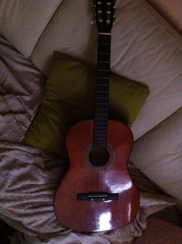 Попроси продавца прислать фото наклейки которая внутри деки. Либо пусть он прочтет то, что там написано и тебе скажет. Тогда будет ясно название. Гитар такой классической формы выпускаются тысячи разных фирм, поэтому по этому фото не определишь. Если продавец готоврит, что покупал за 3000 руб, то бу такая гитара будет стоит половину, т.е. не более 1500р.