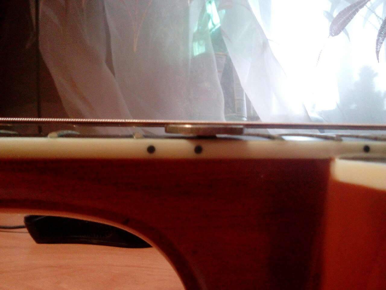 Высота струн стала около 2-2,1 мм, 10 рублевая монета поднимает 6 струну, и прижимается ей, теперь струны на 13 ладу не звенят, как было раньше, нигде не звенят, на всю работу потратил около 2 часов, осталось потом как-нибудь поменять верхний порожек, а то тоже пили ямки под каждую струну)))) Осталось струны купить и можно продолжать играть)