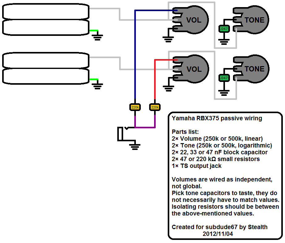 2 тона, 2 громкости - редкое сочетание для баса (без переключателя, как на ЛесПоле). Такая схема, например, у Жабы 62 (Jazz Bass 62s), если я не ошибаюсь. Поищи в нете наиболее понятную тебе. 4 провода со звучка - вывод катушек раздельно. Считай, что два звукоснимателя. Купи новые потцы, гнездо, кондюки, провода и фперед.