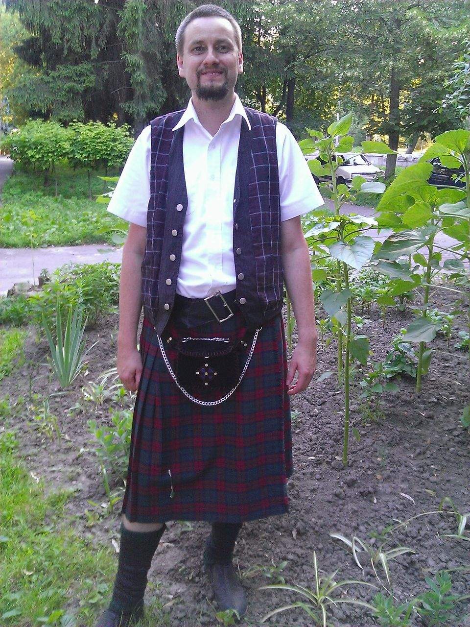 и она мотивировала подарок тем, что мы ж типа играем этот музон, а ей мужская юбка ни к чему) и я решил, что раз есть уже что-то, то надо остальное донайти до образа - слава Богу этот день шопинга закончился успешно (без жены я бы не справился уж точно бы) - я нашёл в секонде вменяемую жилетку (пришлось пуговицы новые поставить и все переделать и вывернуть чуток...), чудом в одном из спорттоваров обнаружил зелёные в клетку гольфы, в секонде взял и рубашку (даже не представляю, сколько сот баксов такая стоит новая...