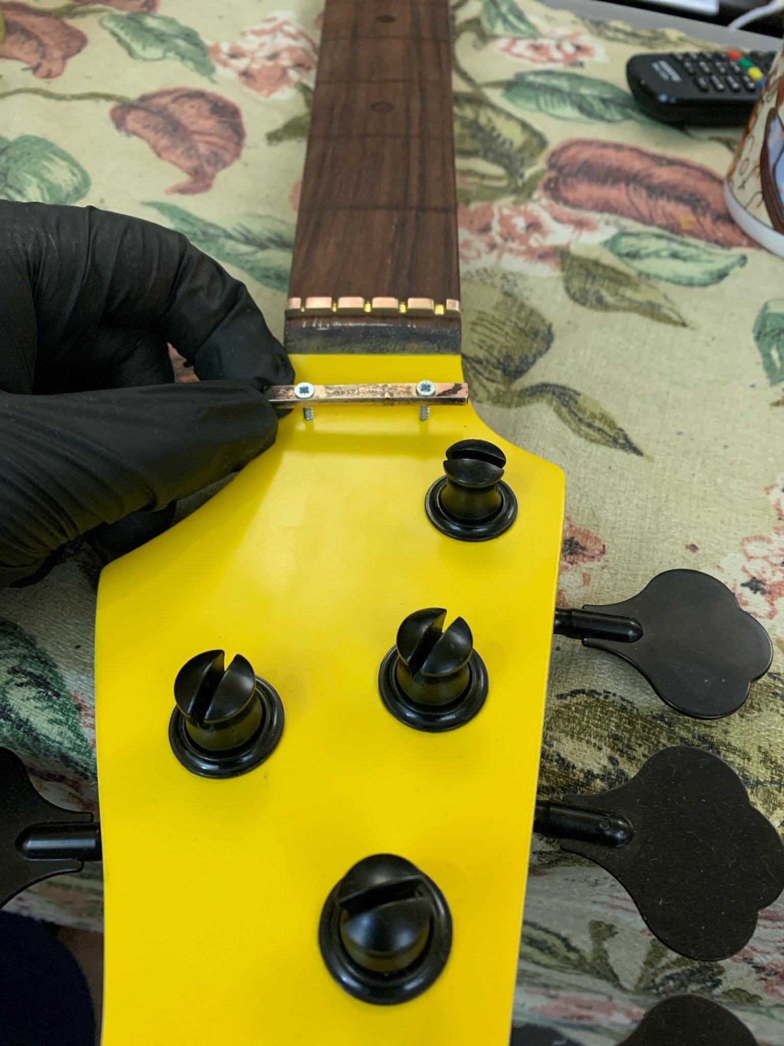 случилась беда. Не повторяйте моей обшибки. Вот эти колки на фото. Отличного черного цвета. То, что я хотел. Есть нюанс. Эти колки были куплены на озоне. Смешная цена. Колки просто ноунейм. Но с ними беда... при установке струн и попытке их натянянуть с шестеренок начала сниматься стружка. Металл очень мягкий. 4 пока еще живы, но на первой струне шестерня погибла, не сразу, но этого я уже ждал. Отломился зуб. Все остальные части, вроде гораздо крепче. Но шестерню не заменить. Пришлось вернуть старый колок.