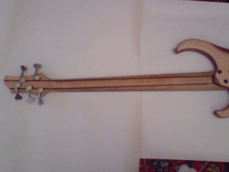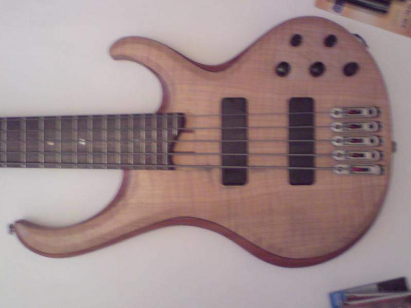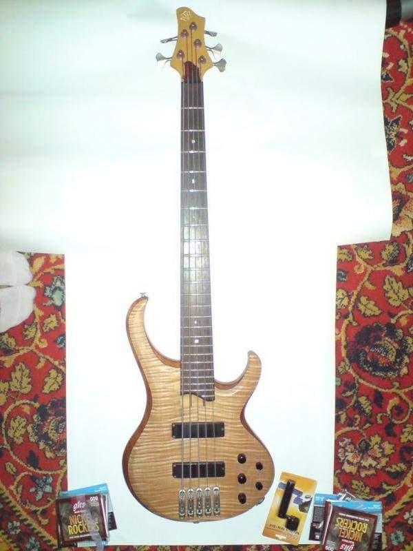 Верхняя дека волнистый клён, тонкая прослойка черное дерево, середина красное дерево, опять черное, нижняя дека липа. Гриф тоже пятислойный.