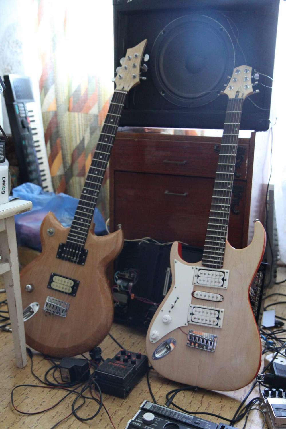 белая гитара была изначально стремнее гораздо-это первый самопал обрисованный по контуру ''Флайт'' , очень долго бился в последствии ибо черновую заготовку мне выпилил из неизвестного дерева один мастер по акустикам-в электро он не соображал и сделал тяп-ляп с фанеркой сзади