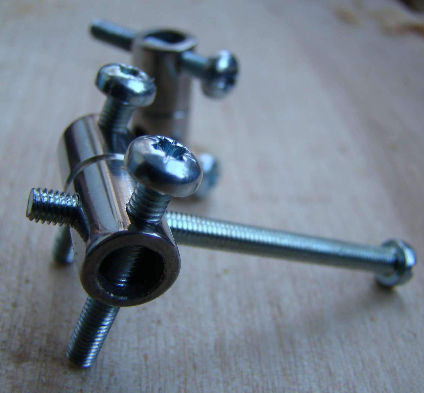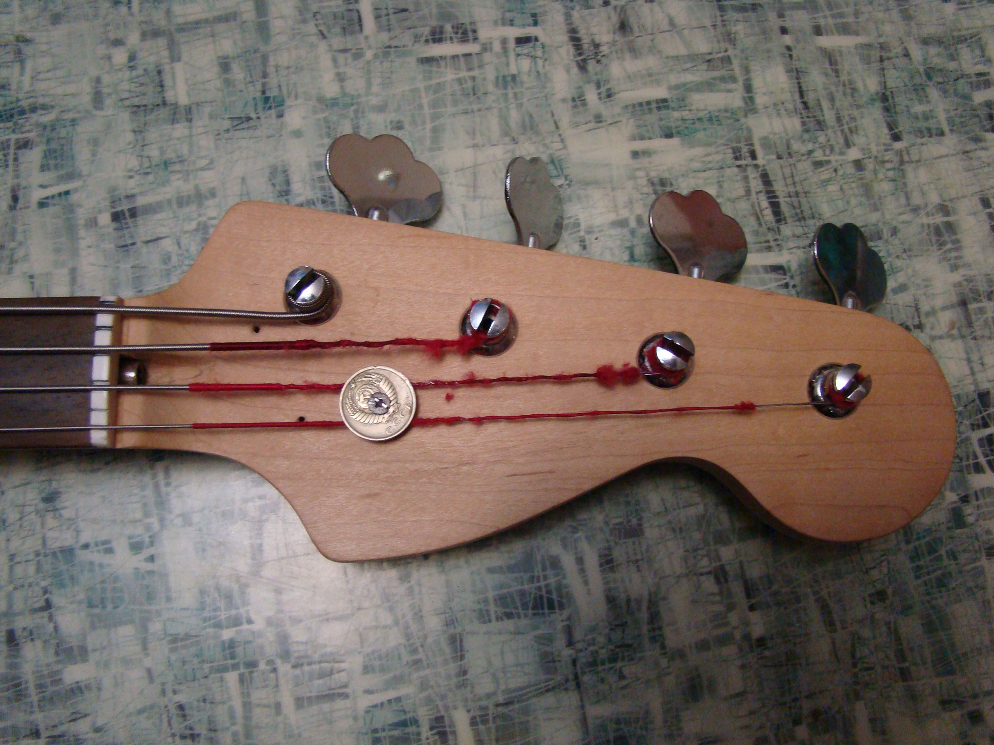 Гриф был сломан, склеен и обезлажен предыдущим владельцем. Накладка ко всему прочему очень сильно сточена, до толщины точек на торцах, поэтому гриф еще тоньше жабьего. Склеен он крепко, колки не болтаются и строй держится неожиданно хорошо. Анкер работает отлично. Ретейнером служит монетка из далекого СССР. К тушке гриф прикручен четырьмя болтами под шестигранник через металлическую пластину.