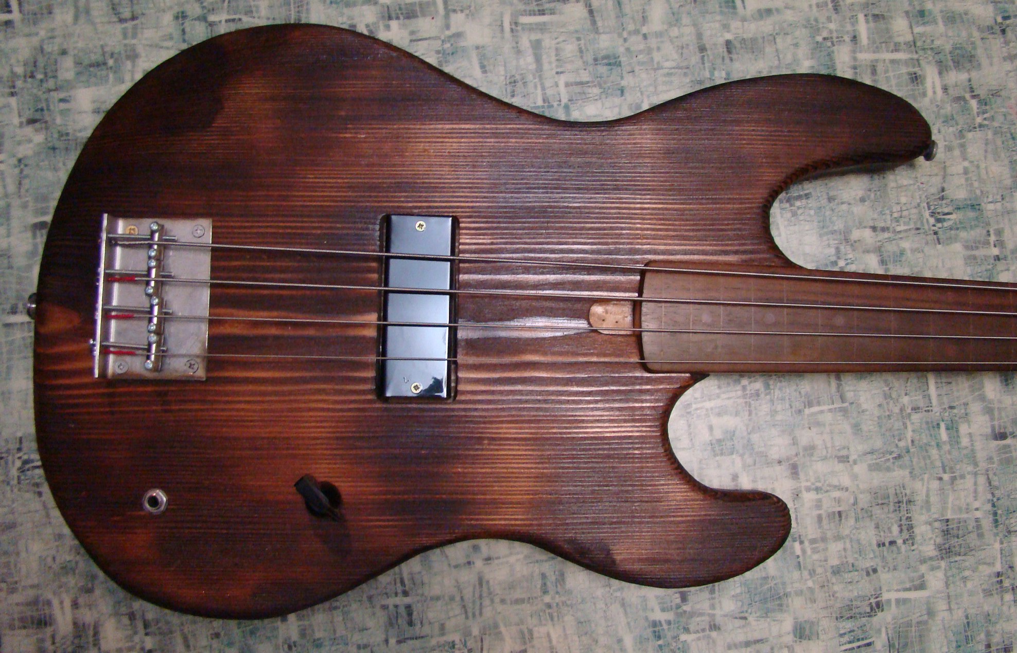 Качество сборки и особенности конструкции: Корпус баса почти имеет классическую форму Прессижн и выполнен из сосны, подвергнутой впоследствии обработке пламенем до выгорания слоев и образования рельефа. После этого тушка была окроплена лаком для защиты музыканта от продуктов горения