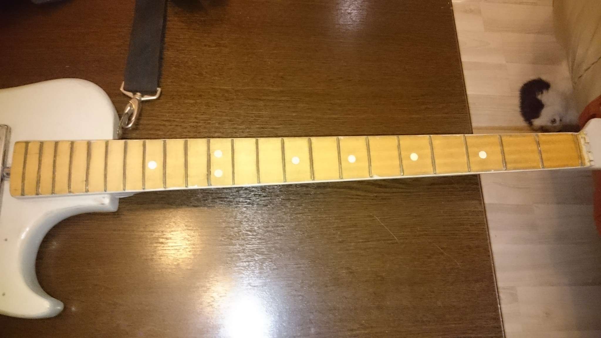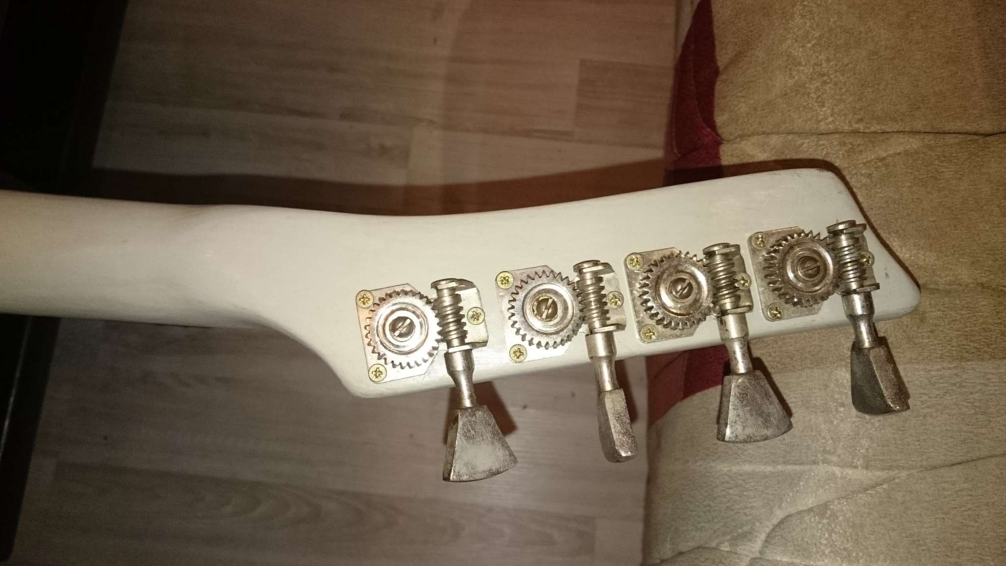 Скажу прямо, в гитарах я не сильно шарю, поигрываю иногда на своей "Zombie" - да и не жалуюсь. Тут вообще другая тема - бас гитара, в них я полный профан. По внешнему виду инструмента сразу становится понятно, что за гитарой давно никто не следит, краска старая, гриф вроде даже лаком не покрыт (а должен?), есть несколько незначительных трещинок в основании грифа и на задней части гитары , но в целом - прошёлся слабым растворителем и почти как новенькая