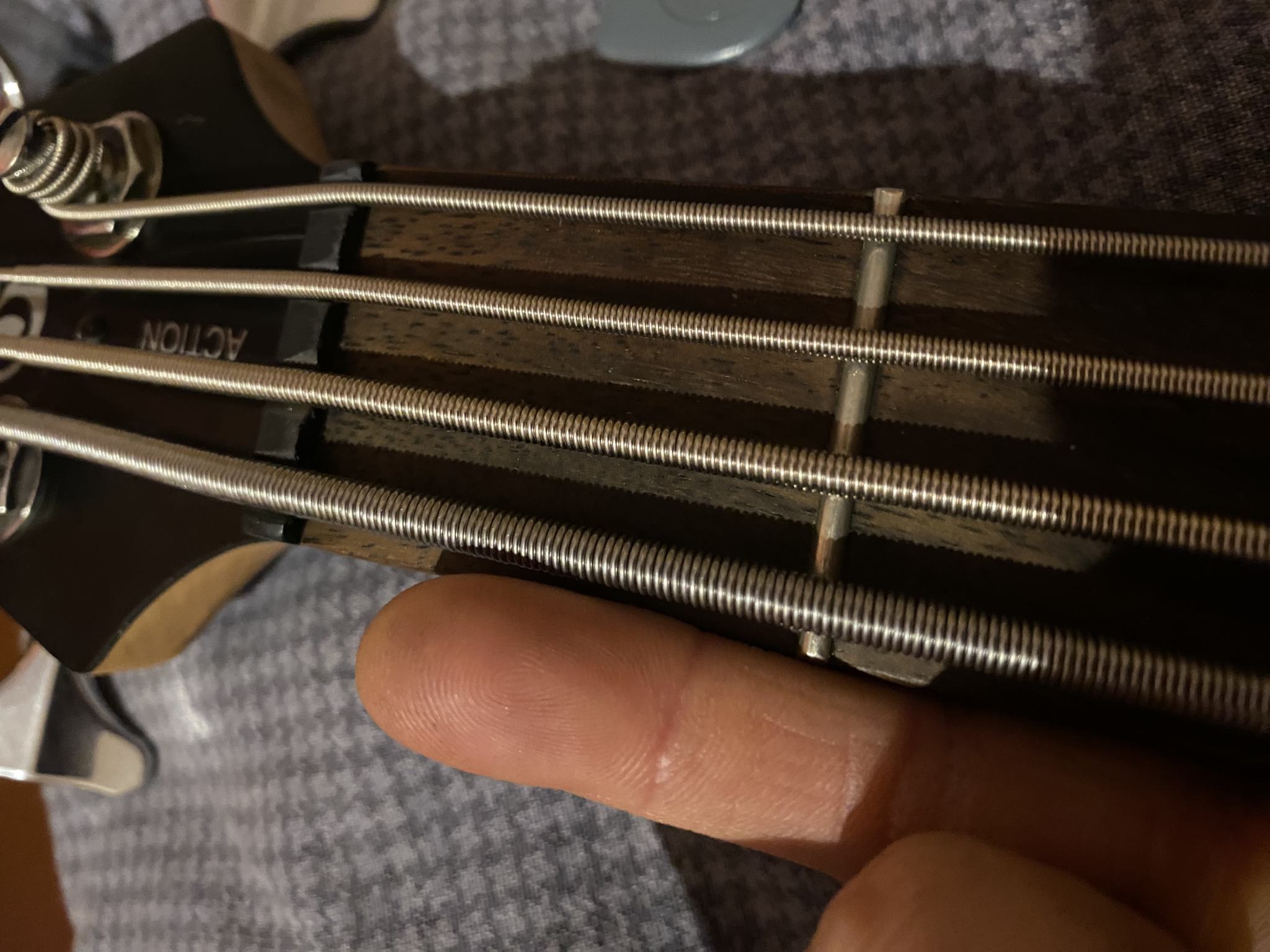 Пишу для тех, кто как и я пытался найти хоть какую-то информацию о том, какие струны ставить на 4-х струнный бас для строя Drop F#. Изначально мой выбор пал на струны ROTOSOUND RS66LH+ DROP ZONE PLUS, но найти их в России очень проблематично. Мне попался сайт USmall, это аналог нашего озона и вайлдберриз, но товары идут из США (так утверждает данный сервис). Эти самые струны там были, я оформил заказ, но в итоге его пришлось отменить, так как слишком долго нужно было ждать доставку, а я хотел здесь и сейчас. Было решено поставить струны от 5 струнного баса, но не весь комплект, а взять только последние три струны. Плюс ко всему нашел на озоне струну 175 калибра, стоила как чугунный мост, но альтернатив не было, она называется Pyramid E 175 Stainless Steel. В итоге кастомный комплект струн получился таким: 175, 135, 105, 85. Для установки конечно же пришлось пилить порожек и рассверлить отверстия в бридже, так как толстые струны просто не проходили по диаметру. Таким образом получилось настроить бас в столь желанный Drop F#, правда немного не хватает натяжения струны 175 калибра, но это уже придирки, так как строй очень специфичный. F# звучит хорошо, читаемо, мощно, особенно если подшаманить настройки процессора. Надеюсь кому-то поможет моя история.