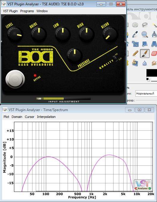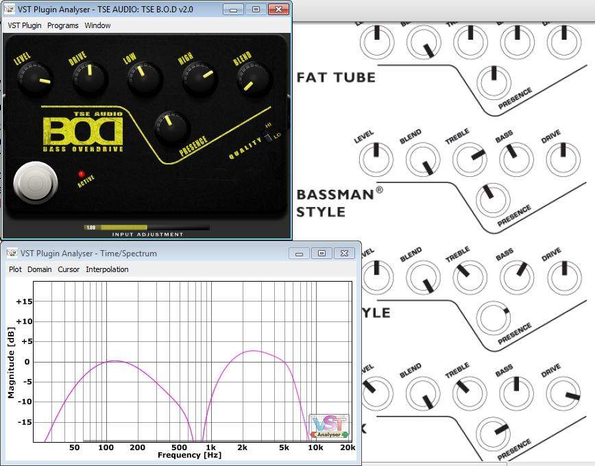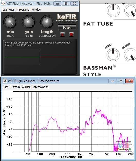 При этом на сайте автора заметил, что появилась вторая генерация ентой "педальки" призванной изображать sansamp'овский bass driver, как я понимаю. В общем немного помучившись с ней и не услышав ничего нового, успокоился и отложил её, но пока разбирался с многообразием других VST-шных плагинов, на глаза попалась программка VST Plugin Analyzer, которая среди прочего умеет показывать изменение АЧХ сигнала плагином...дальше можно было бы написать ещё много букв про "страшную правду", но лучше уже обратить внимание на слайды, замечу только, что первые две картинка это АЧХ с настройками по-умолчанию, а две крайних картинки относятся к попытке эмулировать fender bassman через кефир/импульсы и настройки из букваря sansamp'а