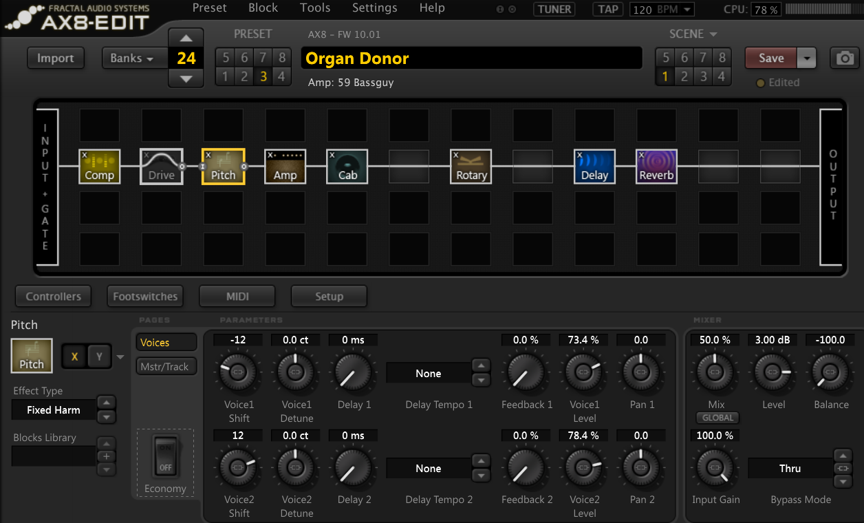 Насчет удобства настройки я же говорил, что совсем немного поковырял его и это была морда, а не AX8 и было это без компьютера. Я знаю, что это чумовой аппарат, но просто у меня не было возможности хорошо с ним разобраться. Да и желания особо нету, он слишком навороченный и сильно выше моих потребностей. И дорогой. Я хоть и не противник цифры, но такие ценники платить за нее пока что не готов. Хотя кто знает, может еще не вечер. Катана у меня первая проба современного цифрового прогресса за долгие годы. В последний раз до этого это был процессор BOSS GT-6 лет 15 назад.