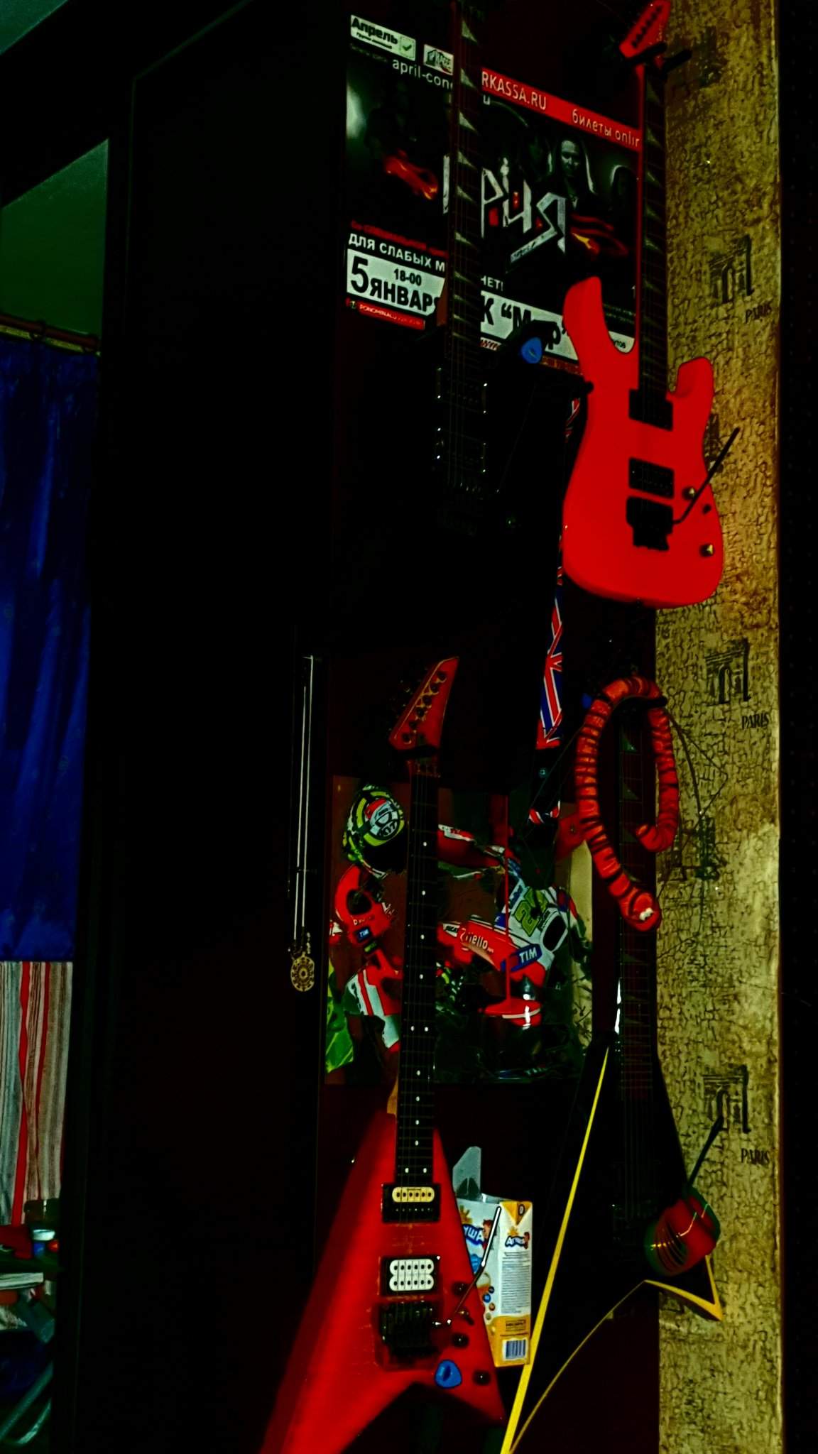 Никогда у меня не было электрической гитары и вот опять... На самом деле чего мне явно не хватает - это места под стойку. Вешают ли электрогитары на стену? Что-то гитара подозрительно тяжелая - 4 кг. В два раза тяжелее акустики, однако. Купил новые гитарные вешалки, но пока не крепил их на стену, чешу репу. Голова-то не отвалится?