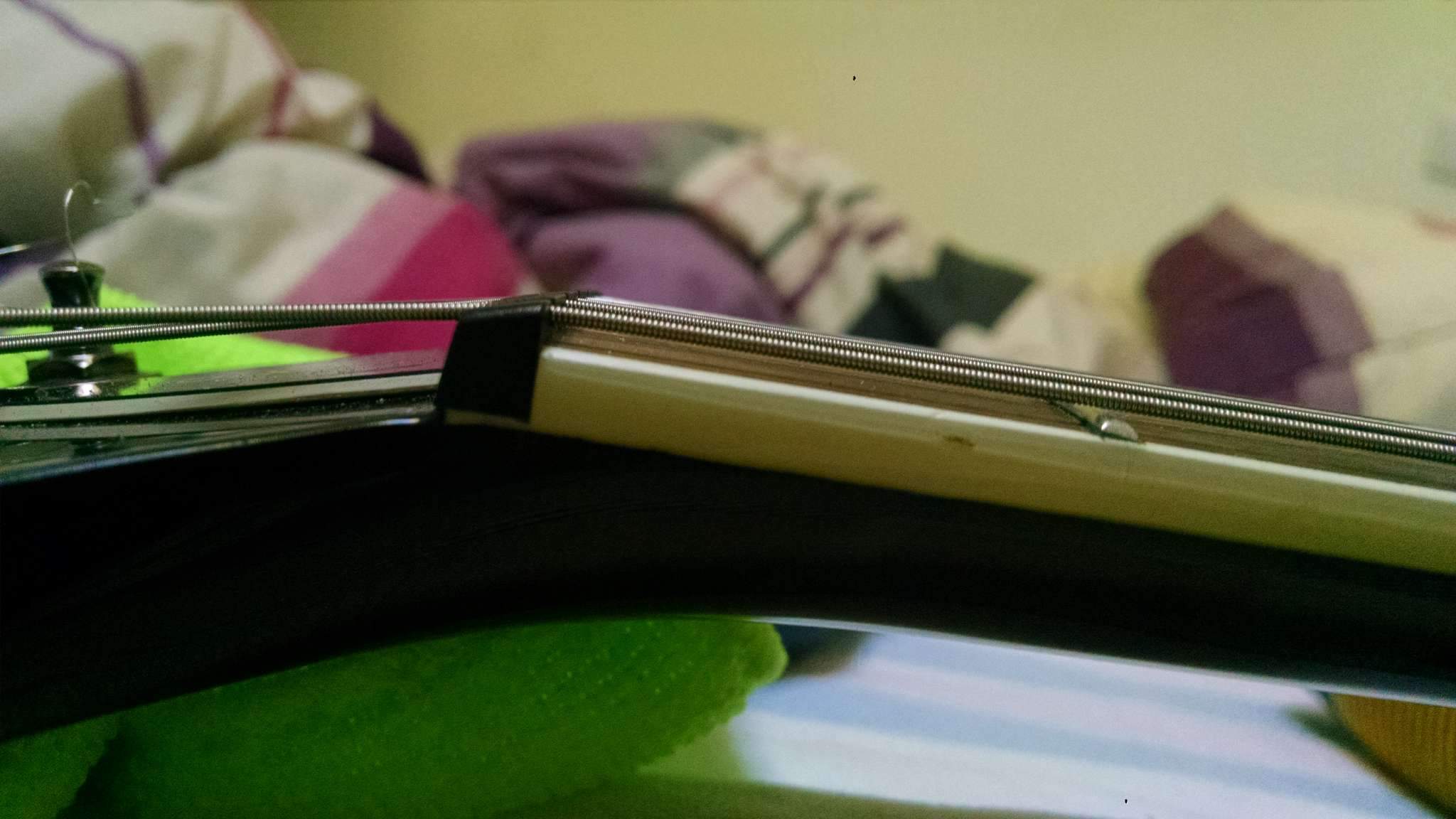 Что касается прогиба, то я сколько ни экспериментировал - никак не смог остановиться на стандартном значении в 0,2-0,4 мм. У меня прогиб минимум 0,5, а то и 0,7 мм. Когда гриф прямой, меня не устраивает ни звучание, ни удобство игры. Высота первой струны над 12 ладом 1,7 мм, высота шестой струны 2,2 мм.