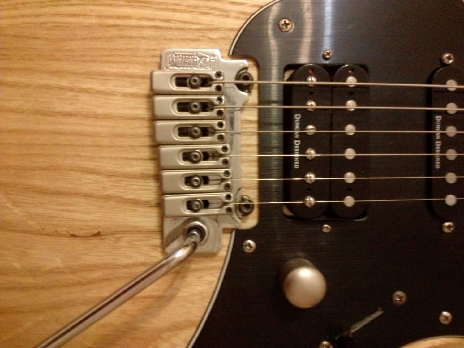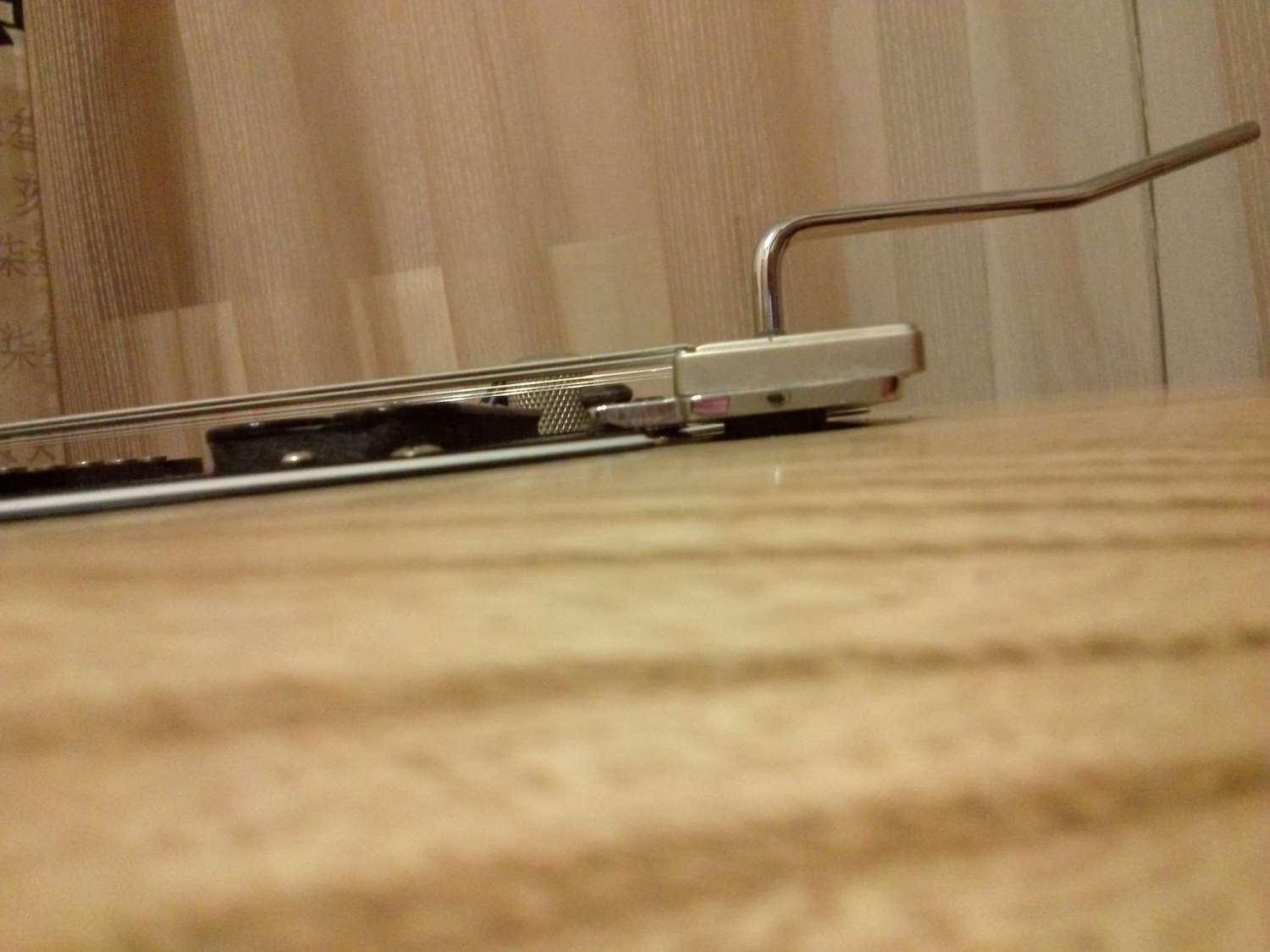 Когда купил гитару тремоло полностью лежало на корпусе, посмотрев картинки в гугле понял что оно должно качать в две стороны. Покрутив винты сзади получилось так.(фото ниже) Строй держит хорошо.
