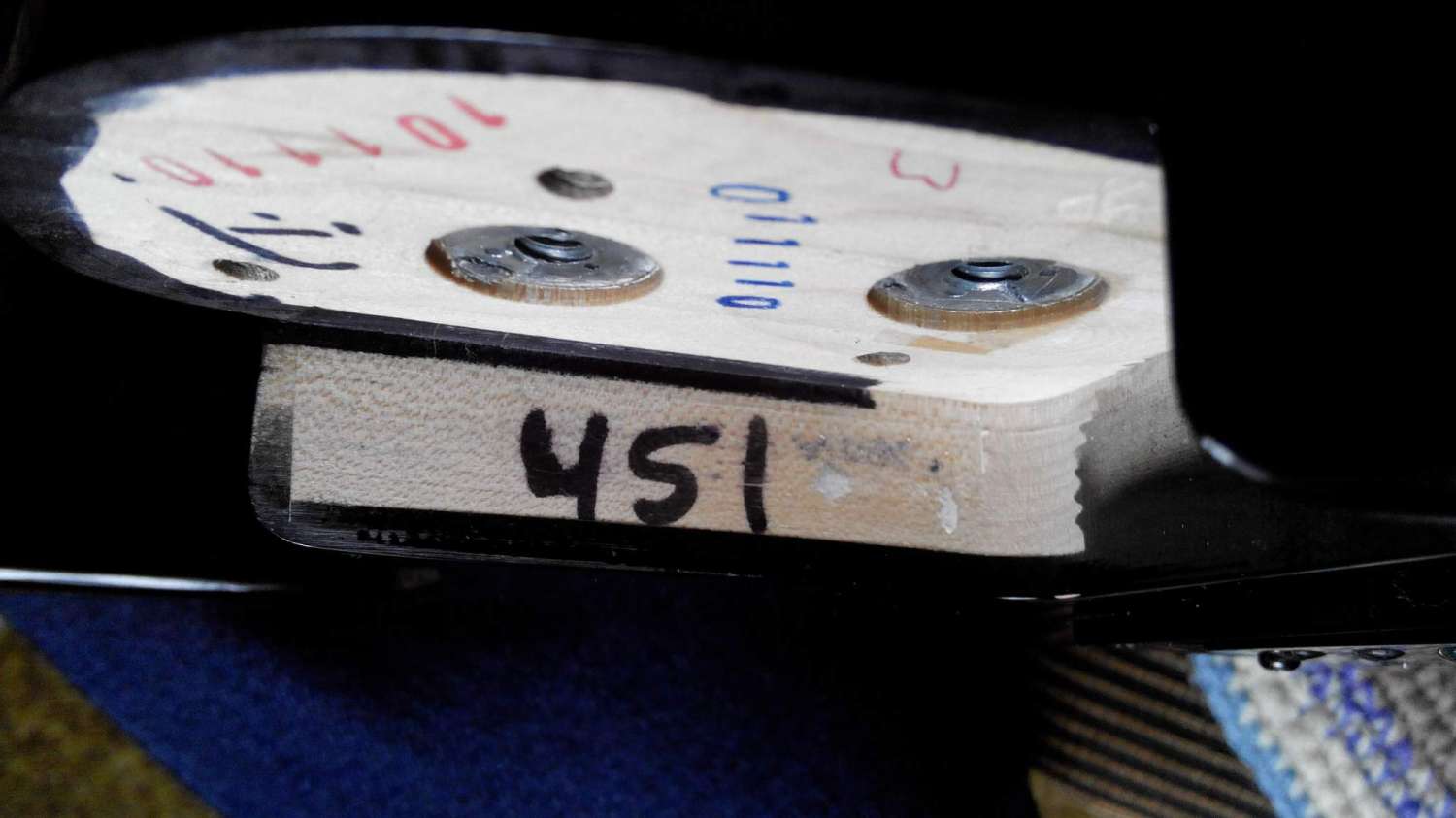 Еще какие-то крепежи вкручены в пятку и в место посадки грифа, для чего? Если посмотреть на пятку грифа под определенным углом, то можно заметить, что лаковое покрытие "обходит" некоторую область возле этих металлических крепежей. Можно предположить, что это крепежи для подвешивания грифа и деки, например, чтобы выполнить их покраску. Так ли это?