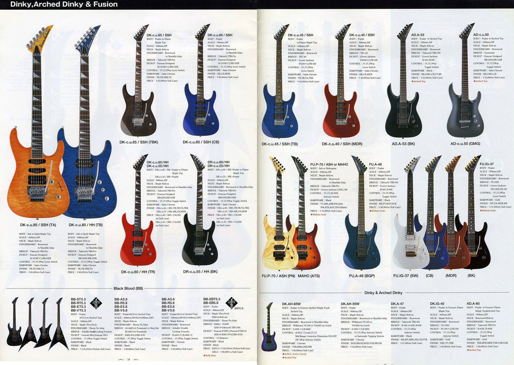 Jackson Dinky — электрогитара — суперстрат с двойным вырезом, изготовленная на Jackson Guitars. Название «Dinky» было дано модели за её слегка уменьшенный, 7 / 8 размер корпуса. Накладка изготавливается из черного дерева, палисандра или совсем недавно из горного клёна. Эта модель также имеет 24 широких лада и всегда гриф с соединением на шурупах. Большинство моделей имеют запирающую оригинальную или лицензионную тремоло — систему Floyd Rose, а также гайку для поддержания стабильной настройки гитары. Некоторые Dinky имеют фиксированный струнодержатель и струны сквозь корпус. Как правило, Jackson Dinky отдают предпочтение гитаристы, играющие в стилях хард-рока и хэви-метала.В 1994 году Гровер Джексон продал свою компанию новым хозяевам, а у фабрики Chushin Gakki кончился договор с Kyowa Shokai, у которых было право на марку Jackson на территории Японии. Теперь внутрияпохи уже не могли отделаться словом джексон через всю клюху с маленькой припиской - тогда появилось длинное макаронное лого двумя словами во всю бошку. Коэффициент крутости модели был задан наконец по-человечески и однозначно - цифрой. Самые дешевые модели имели индекс ниже сотни, 100+ середнячки, и топовые инструменты устремлялись под 200 и выше (кстати, все эти цифры означают цену в тысячах йен, что тоже удобно). Была серия в 300+ килойен, эти гитары выглядели довольно специфично и попадаются крайне редко.