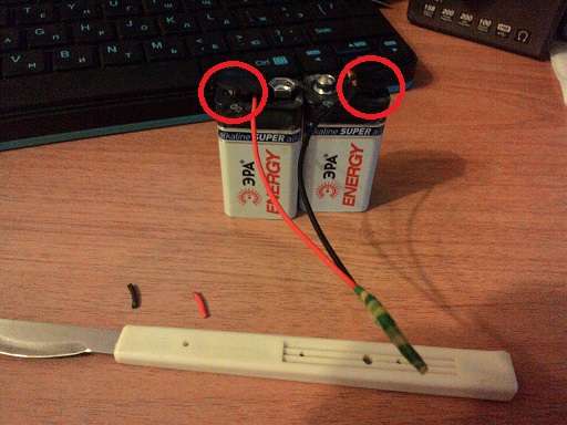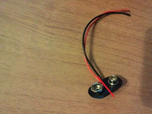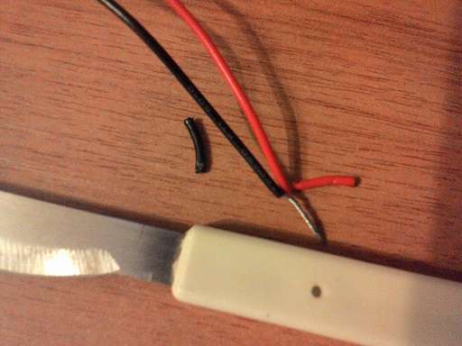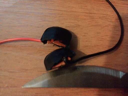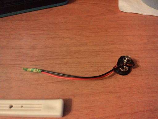 1. К изначальной клемме для батарейки из джека ведут 2 провода - красный(+) и черный(-). Разрезаем черный провод в нескольких сантиметрах от клеммы и зачищаем оба конца.